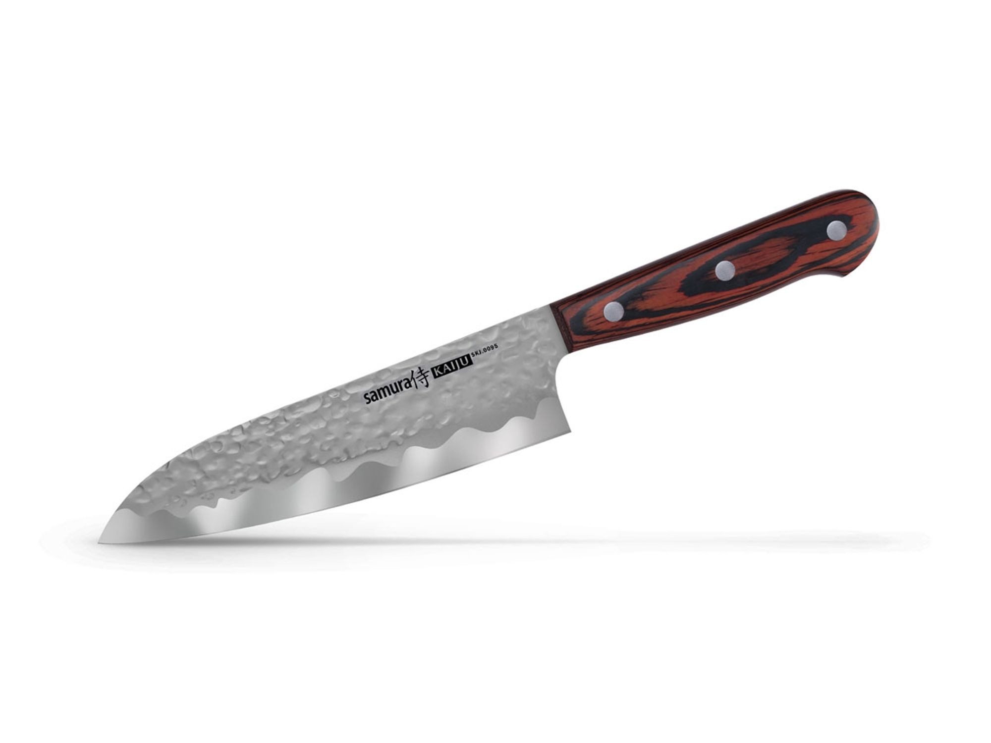 Die Kaiju Serie von Samura bietet moderne Kochmesser aus gehämmertem Edelstahl. Die Messer verbinden eine klassische Silhouette mit modernem Design und Materialmix. Die Klingen sind poliert mit Hammerschlag-Optik. Der Griff wird aus Pakkaholz gefertigt.