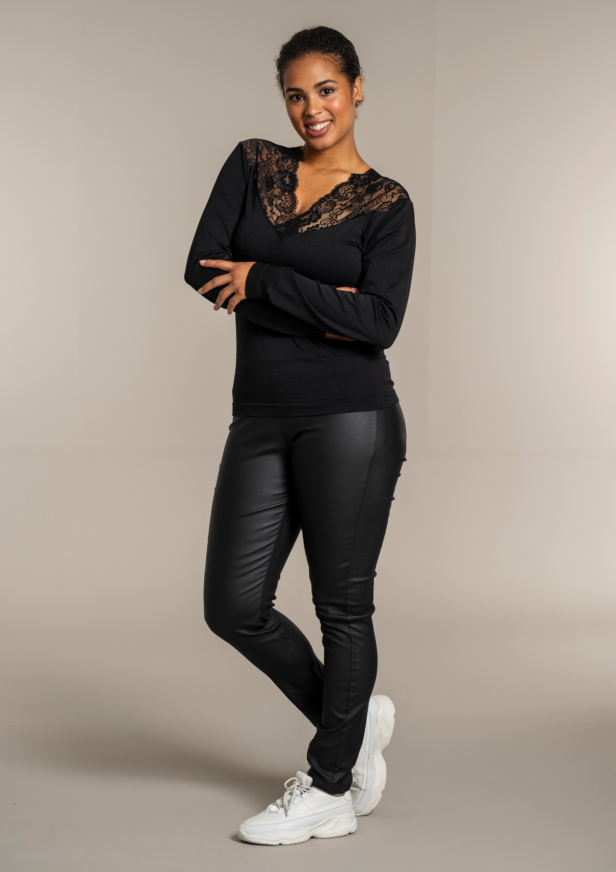 Für das Büro-Outfit kann das Oberteil mit einer Stoffhose und Pumps oder Ankle Boots kombiniert werden. Für ein sportliches Outfit können elastische Leggings angezogen werden.