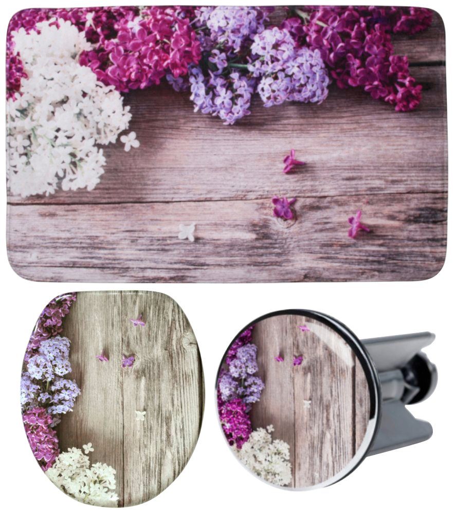 Set beinhaltet | WC-Sitz, Badteppich 70 x 110 cm und WaschbeckenstöpselWC-SitzMaterial:• Holz (stabile Ausführung)Maße:• Außenmaß: L / B = 47,0 / 37,7 cm• Innenmaß: L / B = 26,7 / 23,0 cm• sehr stabile Scharniere, die in der Breite zwischen 11,0 bis 20,5 cm verstellbar sind (rostfrei)• passend für alle handelsüblichen WC-Becken (Hänge- und Steh WC-Becken)Eigenschaften:• mit Absenkautomatik (WC-Deckel und Sitz schließen sanft und leise)• hochwertige Oberfläche • antibakterielle Beschichtung• einfache Befestigung mit beiliegendem Montagematerial• sehr bequemer Sitzkomfort• stabile Abstandshalter unter dem WC-Sitz• belastbar bis 200 kgBadteppich 70 x 110 cmMaterial:• 100% Polyester• Unterseite gummiertMaße:• Длина: 70 cm• Breite: 110 cm• Gesamthöhe: 1,5 cmEigenschaften:• super weich, hautfreundlich, schnelltrocknend • saugstark und strapazierfähig• rutschhemmend durch gummierter Unterseite• Fußbodenheizung geeignetWaschbeckenstöpselMaterial:• rostfreier Messingkopf (verchromt)• KunststoffkörperMaße:• passend für alle handelsüblichen Waschbecken• Durchmesser 4,0 cm• variabel höhenverstellbar von 6,5 bis 8,5 cmEigenschaften:• hochwertige Qualität • einfach in das Waschbecken zu setzen• für die Befestigung wird kein Werkzeug benötigt• wasserdicht |