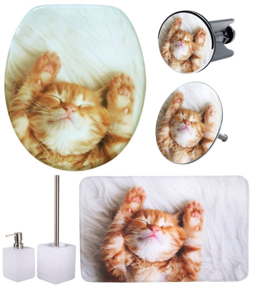 Lieferumfang | WC-Sitz, Badteppich, Stöpsel, Seifenspender, WC-Bürste |