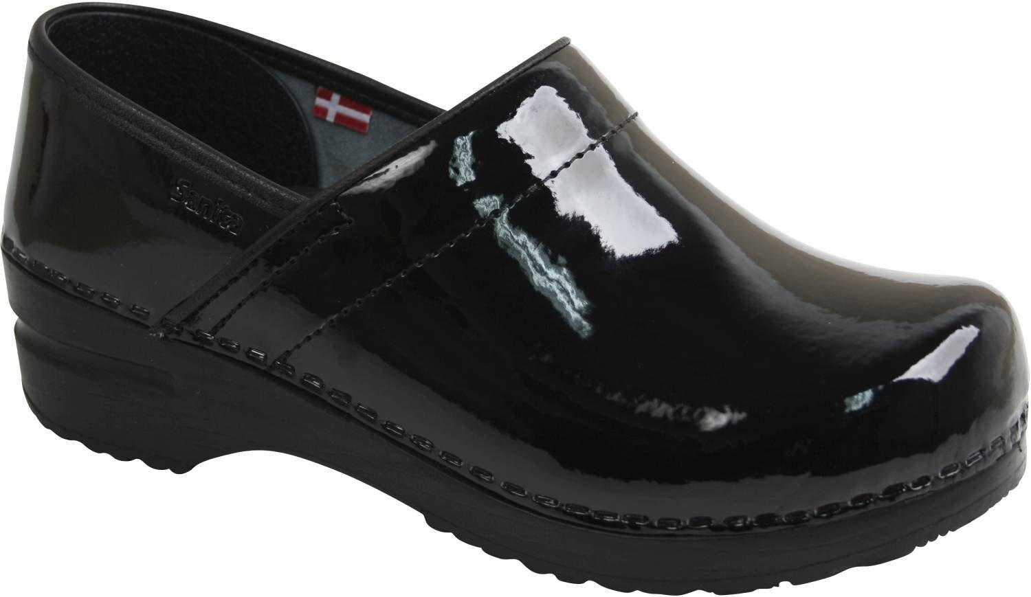 Dieser Clog ist aus hochwertigem Patentleder gefertigt und verfügt über eine weiche Mikrofaser-Innensohle für ultimativen Tragekomfort