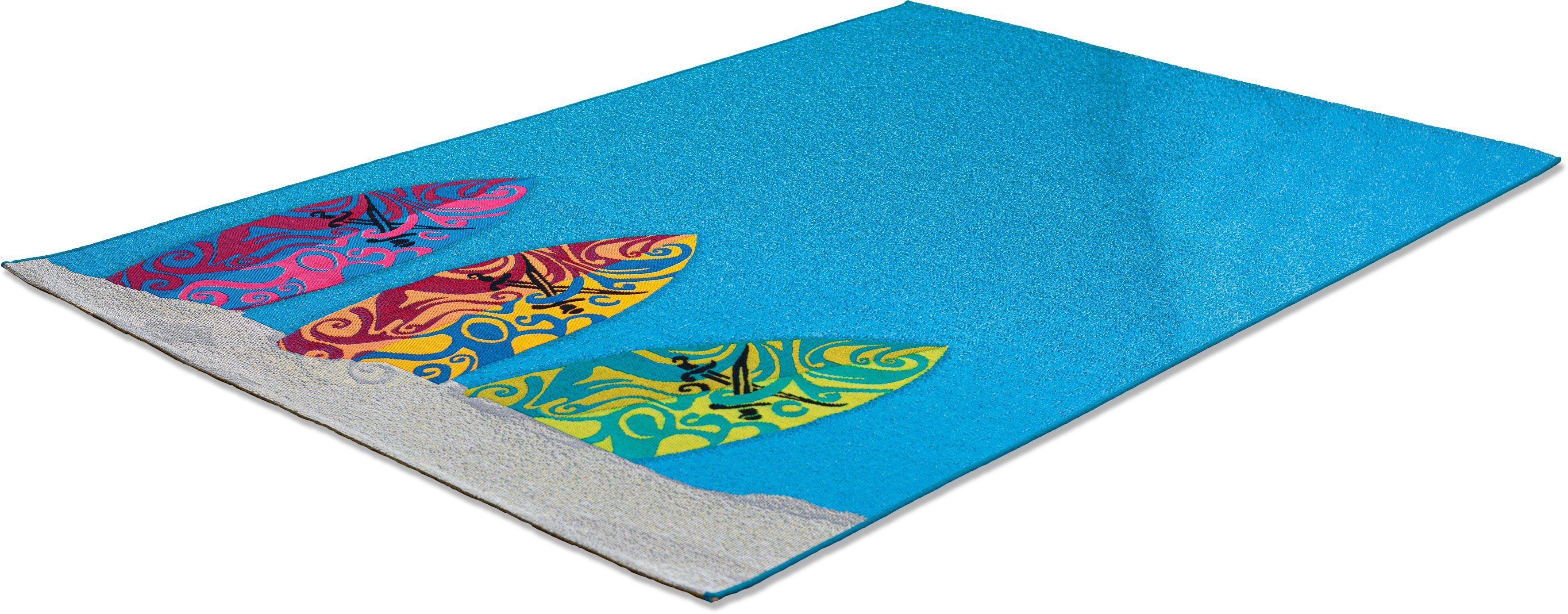 Genieße das farbenfrohe Design des RANTUM-BEACH Teppichs – perfekt für drinnen und draußen, bringt er das Syltflair direkt zu dir nach Hause