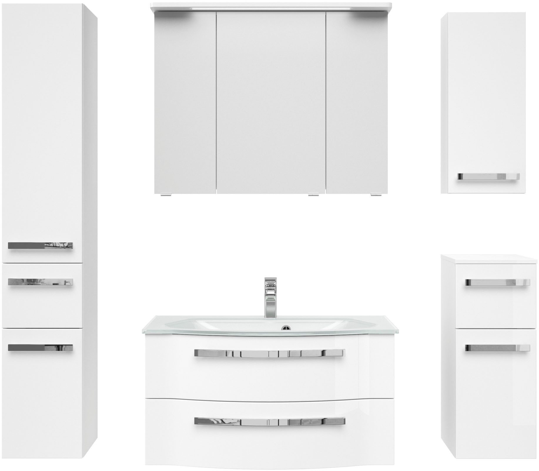 Set beinhaltet | Waschtischunterschrank, Glaswaschtisch, Spiegelschrank, Hochschrank, Hängeschrank, Unterschrank |