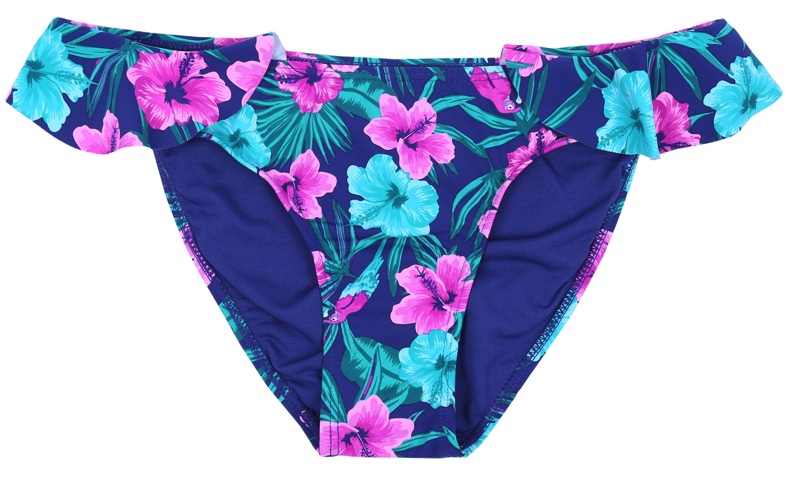 Schöne, dunkelblaue Damen-Badehose mit violetten und grünen Blumen gemustert.