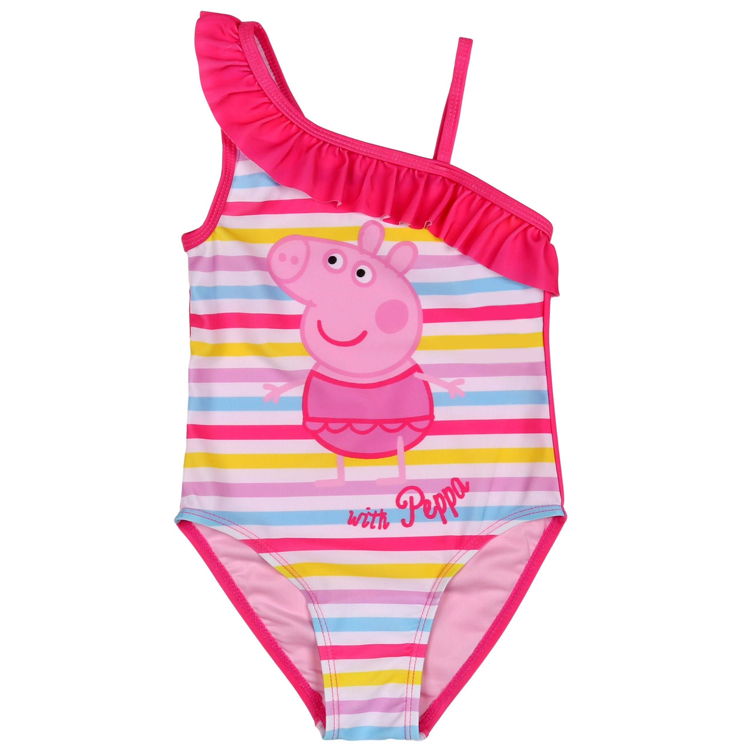 Niedlicher einteiliger Badeanzug mit bunten Streifen, bedruckt mit dem Bild der Titelfigur der Zeichentrickserie "Peppa Pig".