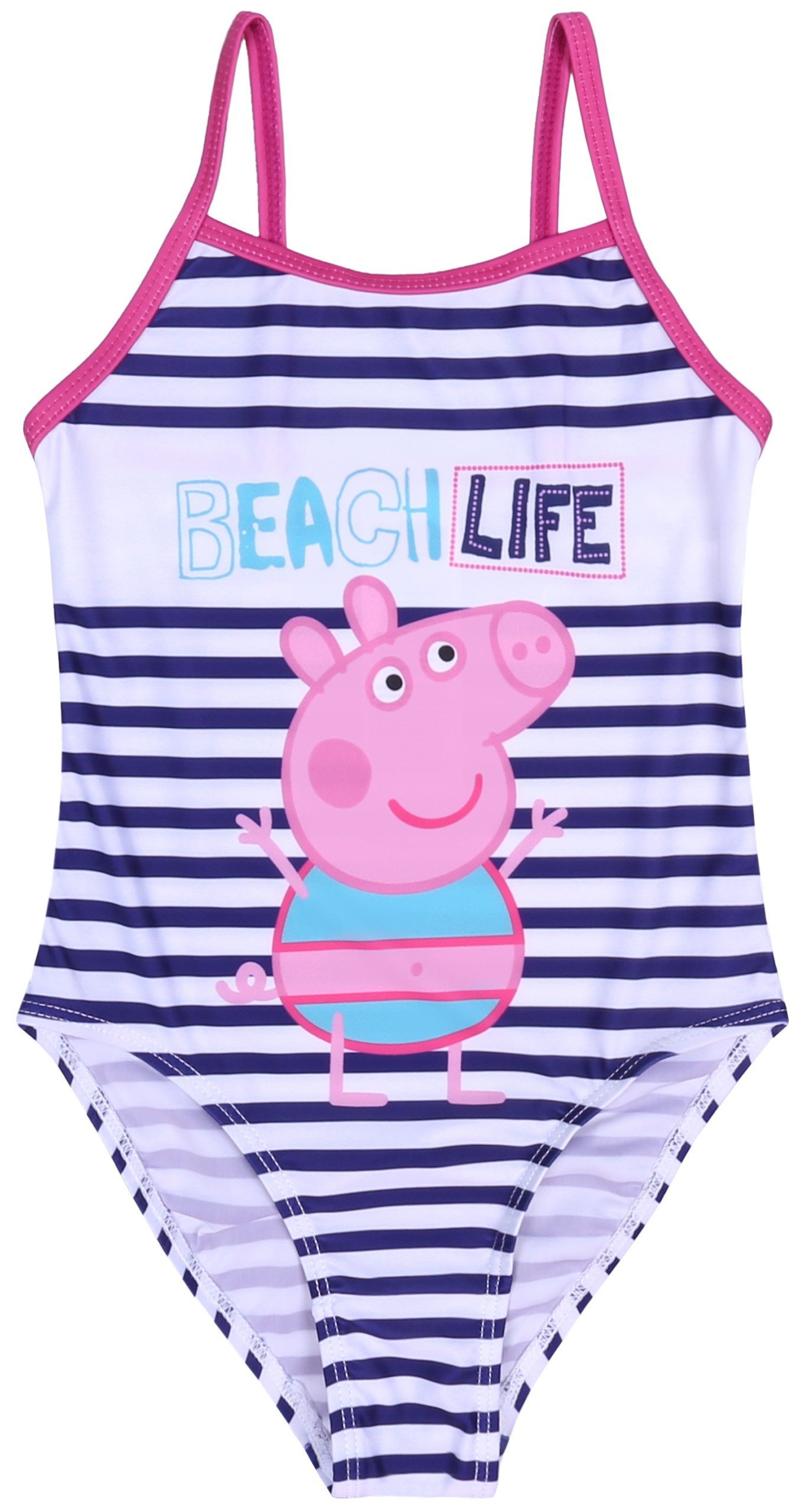 Vorne mit bunter aufgedruckter Abbildung von Peppa Wutz, ganzer Badeanzug mit waagerechten, dunkelblau-weißen Streifen.
