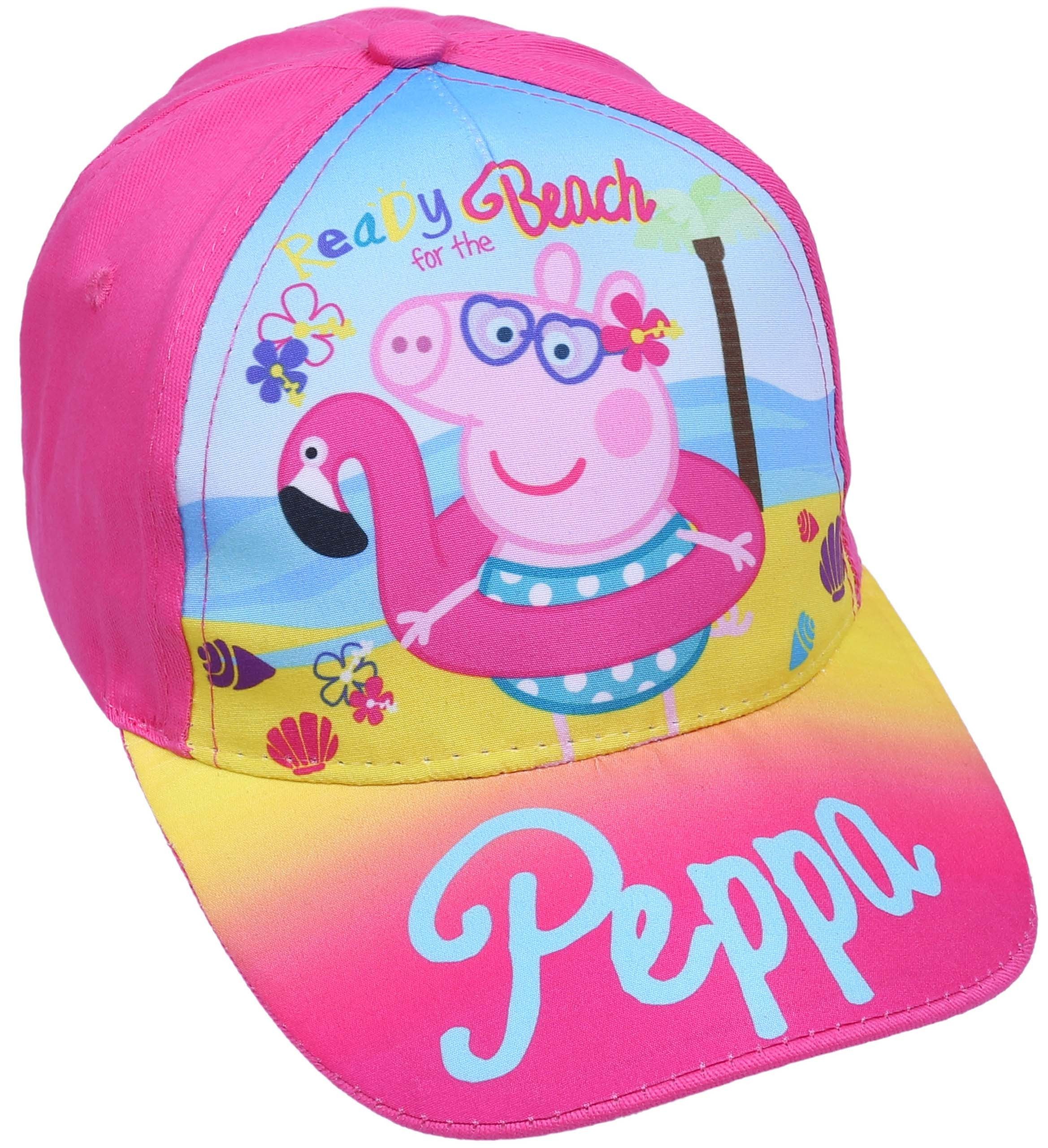 Dunkelpinke Schirmmütze mit dem bunten Motiv aus der Zeichentrickserie ''Peppa Wutz''.
