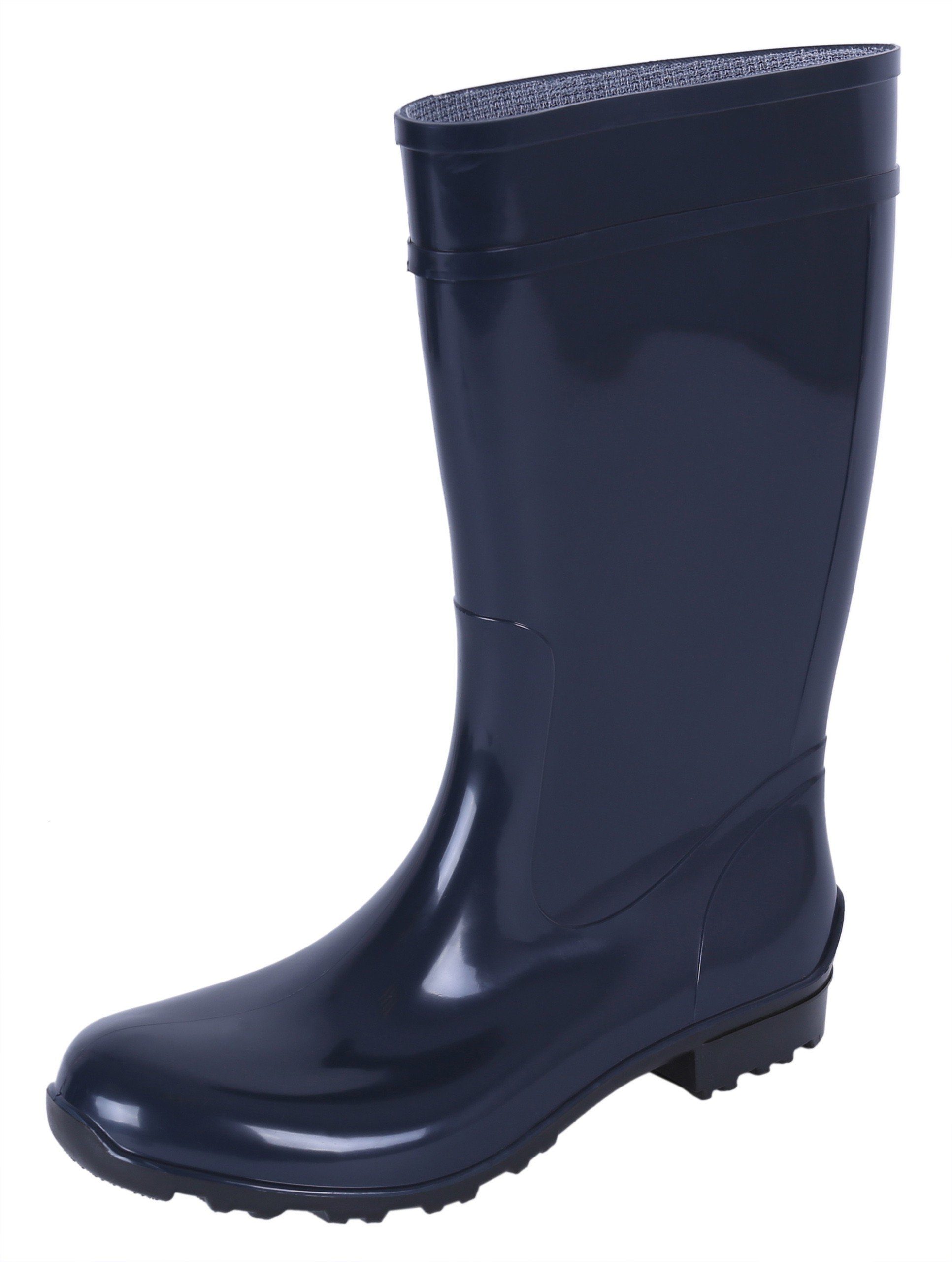Praktische und moderne, dunkelblaue Gummistiefel wurden aus qualitativ sehr gutem PVC-Kunststoff hergestellt.