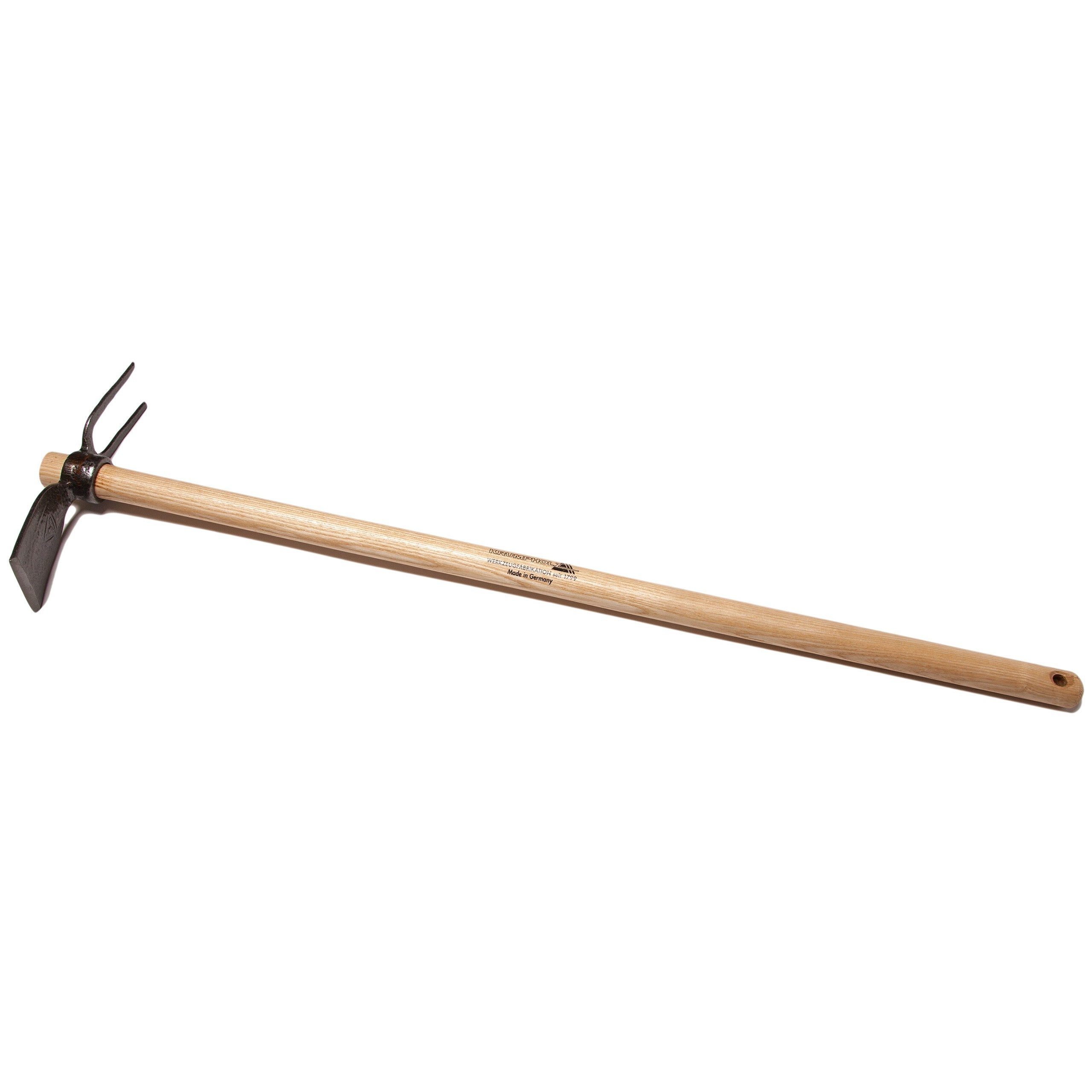 Das Arbeitsteil hat eine gerade Seite zum Ziehen von Unkraut und eine Seite mit zwei Zähnen zum Lockern des Bodens.