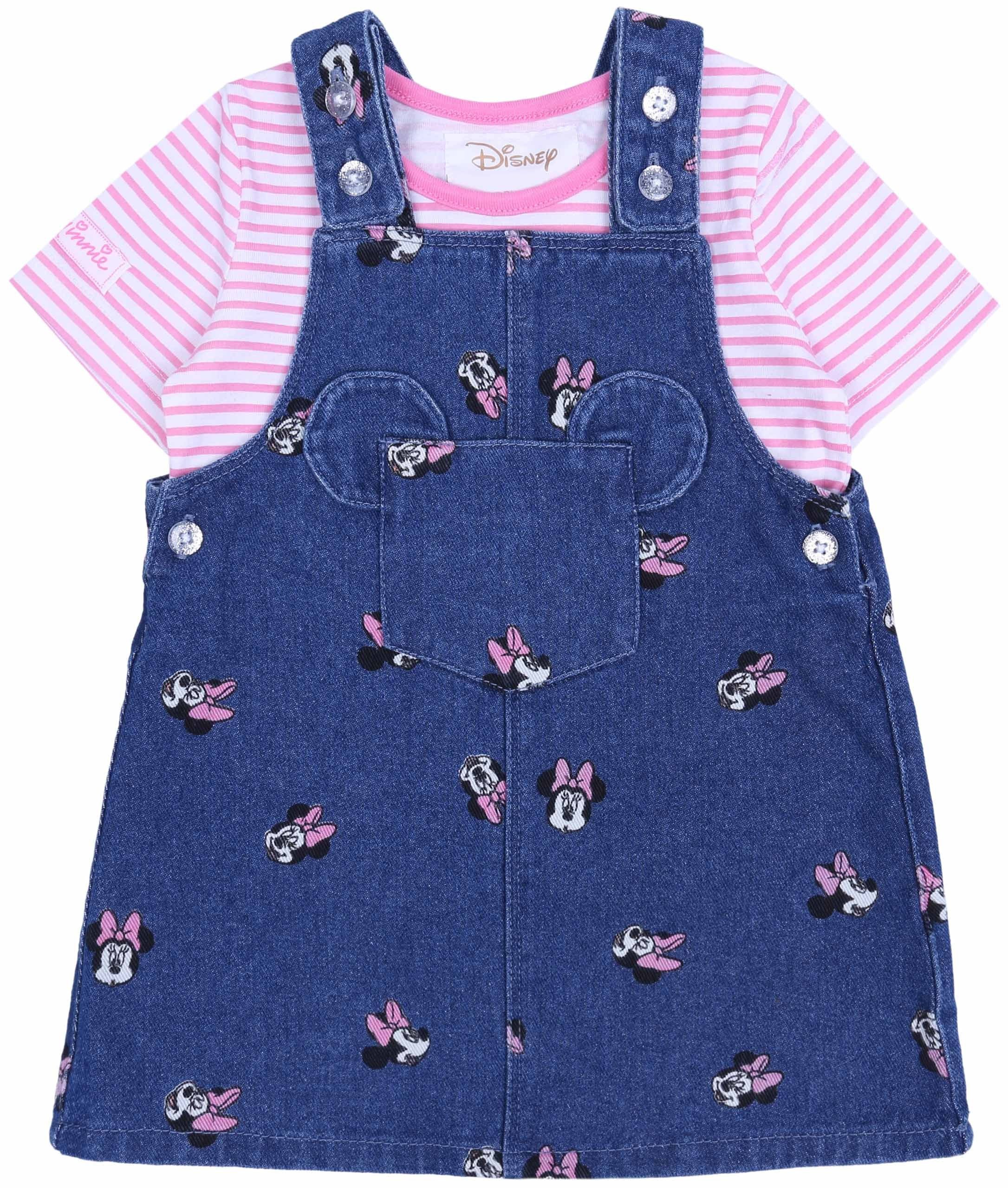 Schönes Jeanskleid/Latzkleid mit sich wiederholender Abbildung von Minnie Mouse.