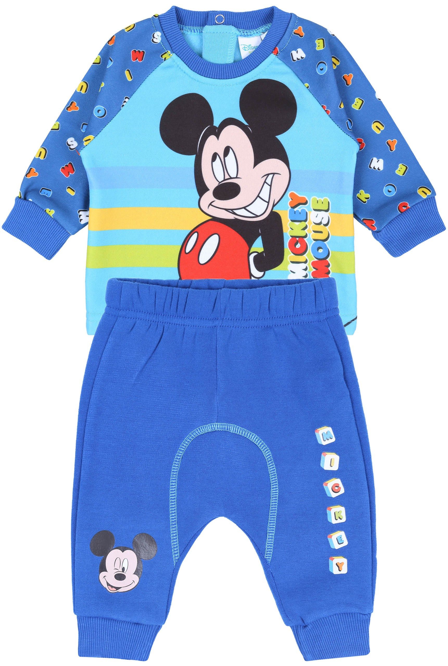 Sweatshirt in Blautönen über den Kopf gezogen, mit dem Bild von Mickey Mouse auf der Vorderseite.