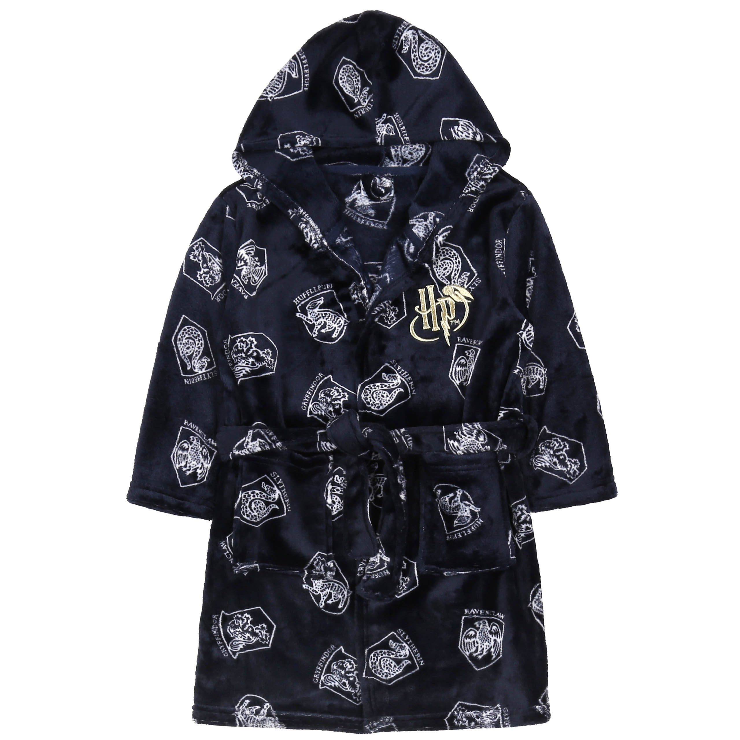 Ein dunkelblauer, in der Taille gebundener Bademantel mit sich wiederholenden Symbolen der Häuser von Zauberschule in Hogwart.