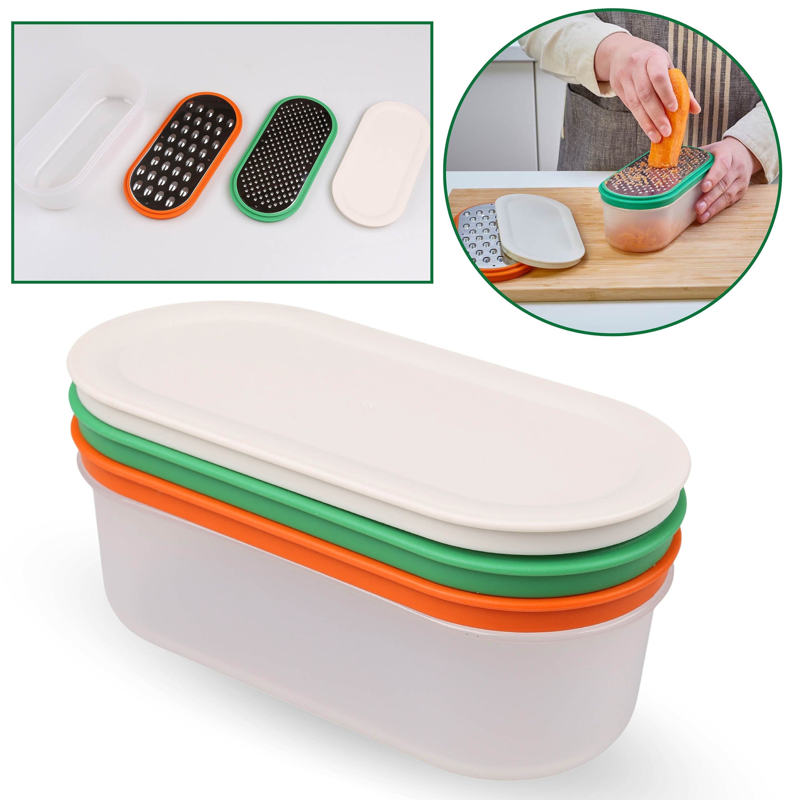Das Set besteht aus zwei Gemüsereibe mit unterschiedlichen Maschenweiten, einem Deckel und einem Behälter für geriebene Produkte. So lassen sich die Zutaten für Gerichte leicht zubereiten und es herrscht Ordnung.