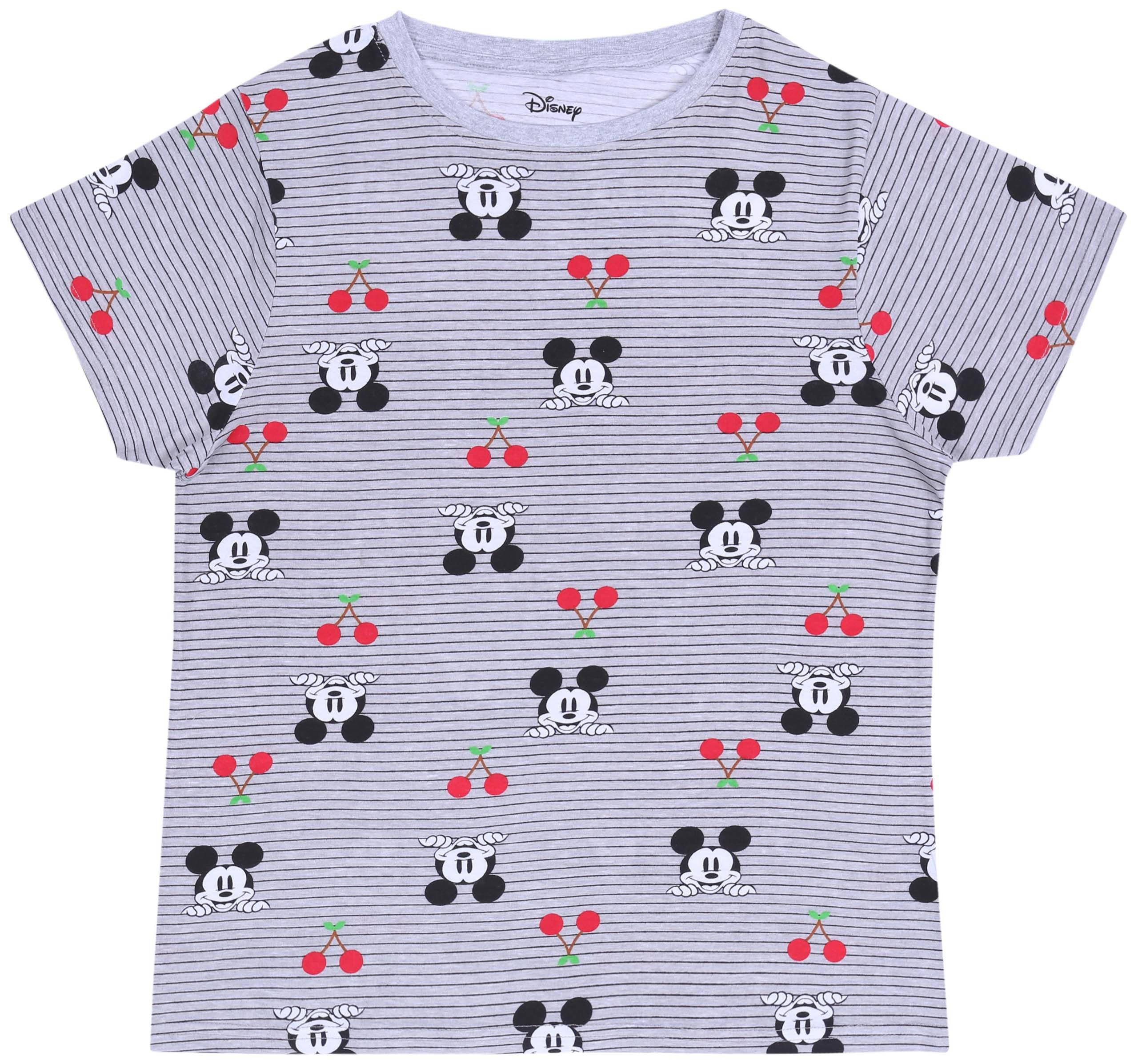 Graues, schwarz gestreiftes, kurzärmeliges T-Shirt mit sich wiederholender Abbildung von Mickey Maus und Kirschen-Motiv.