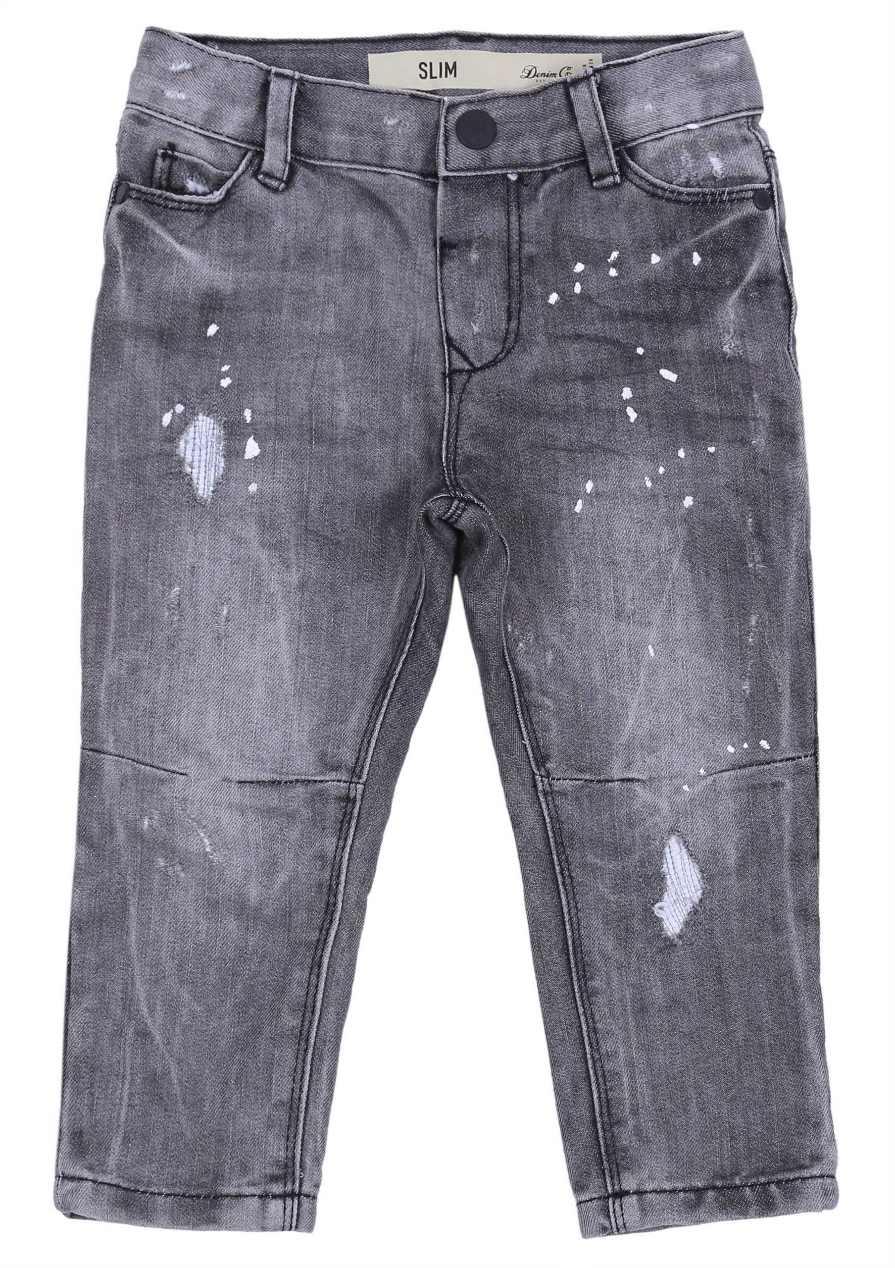 Die Hose ist mit modischen Reibungen, Schattierungen und weißen Flecken versehen.