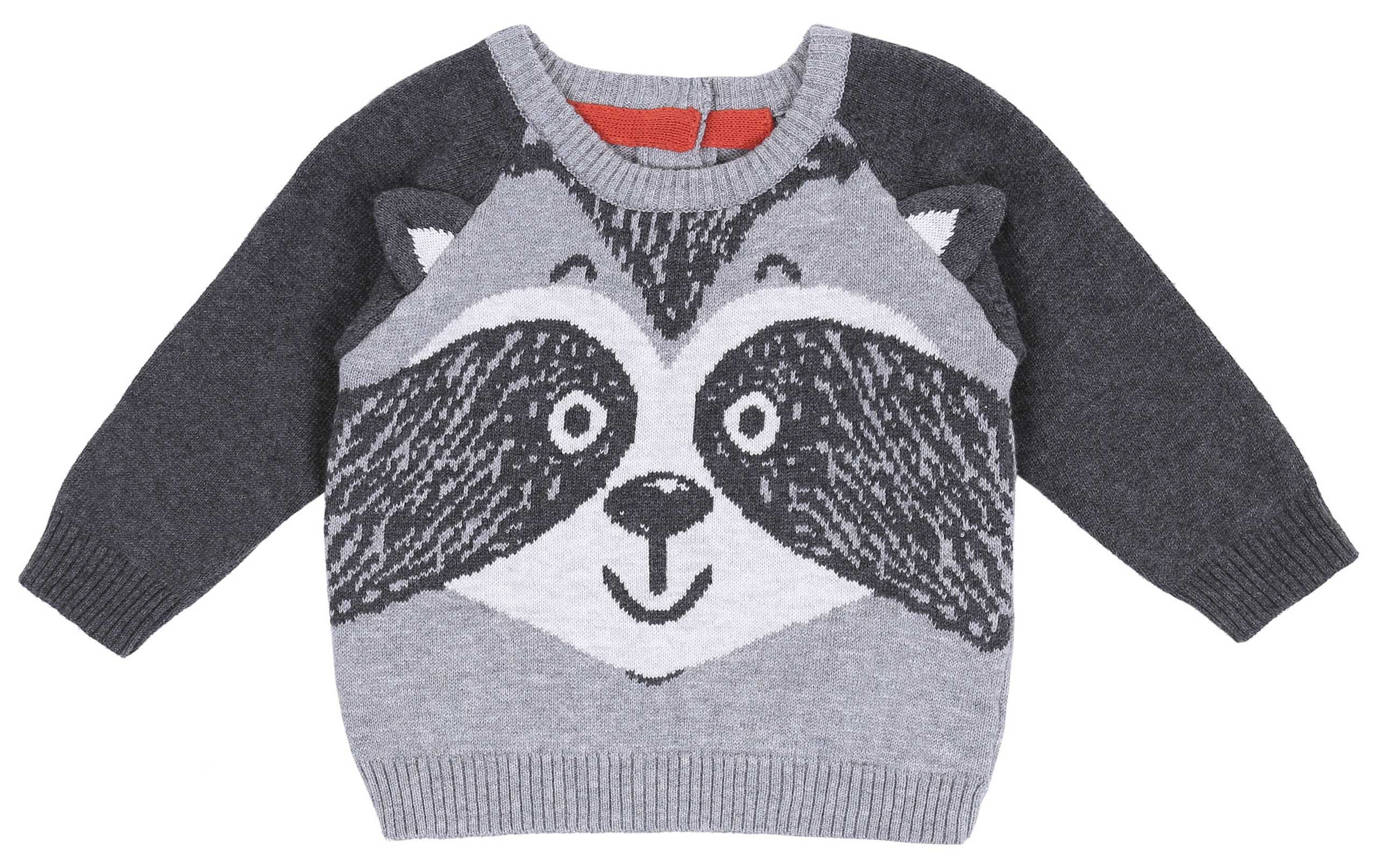 Grauer Baby-Pullover mit einer süßen Abbildung des Waschbären verziert.
