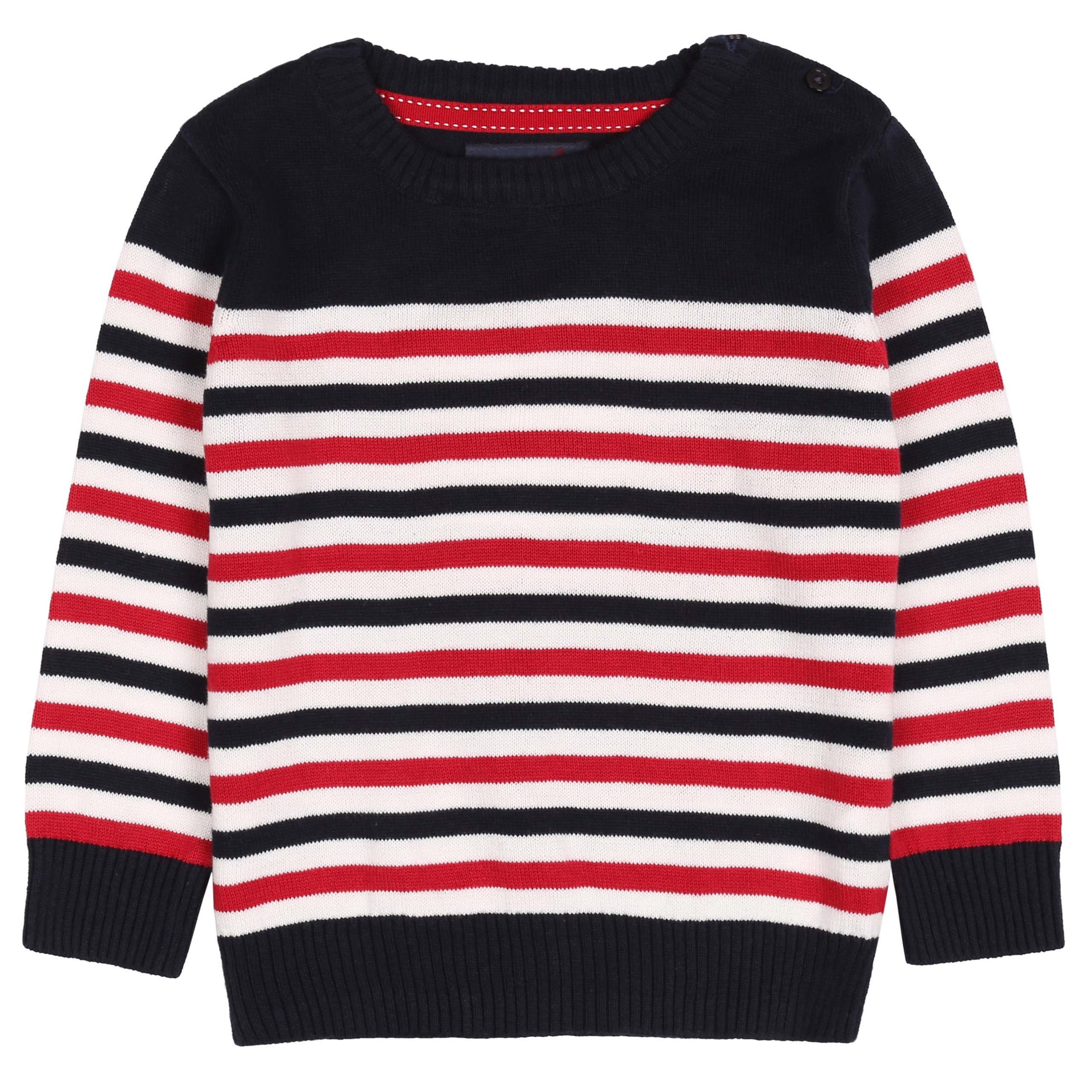 Der Jungen-Pullover mit rot-dunkelblauen Streifen mit feinen Strickbündchen an den Ärmel.