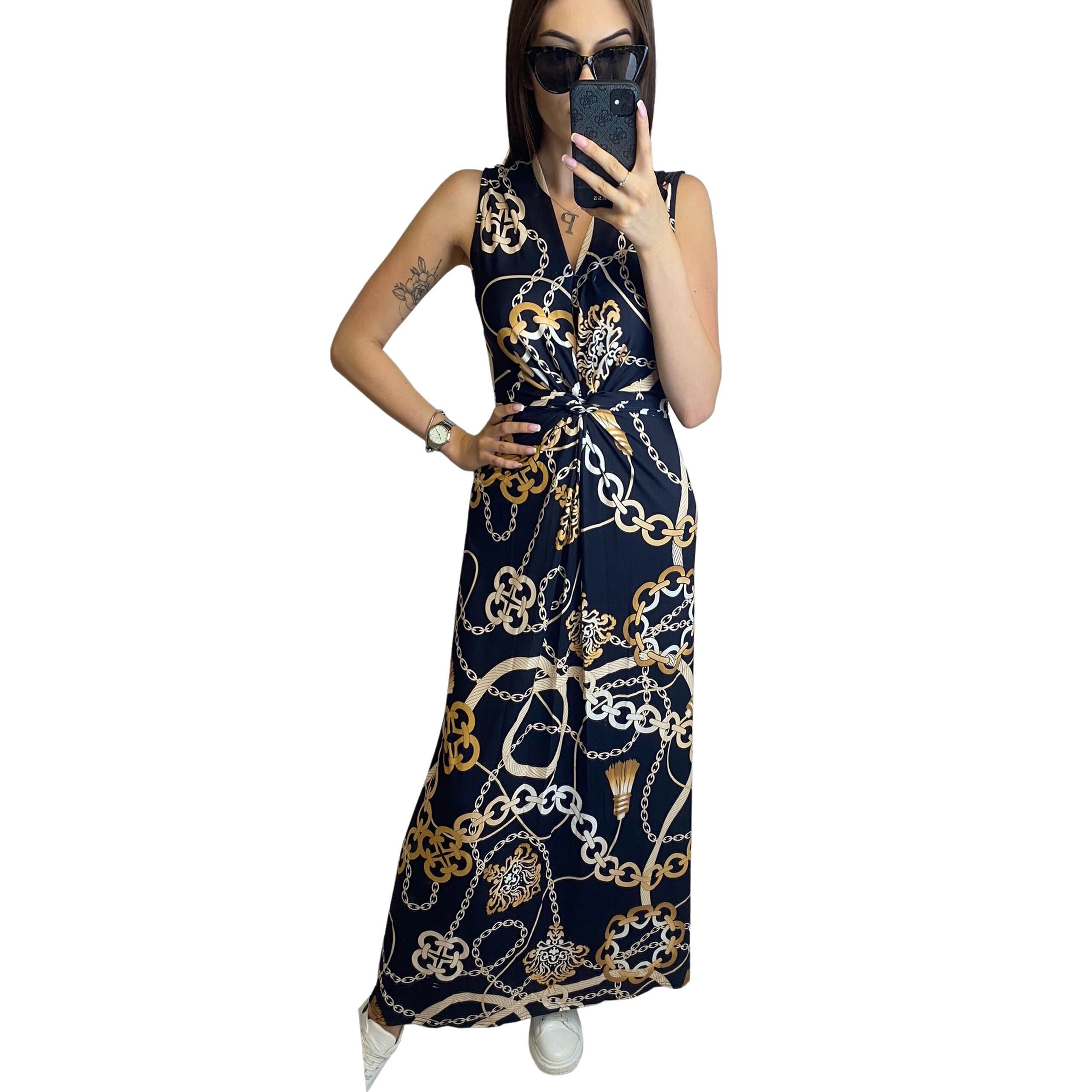 Schwarzes Maxikleid mit goldfarbenem, modernen Kettenmuster.