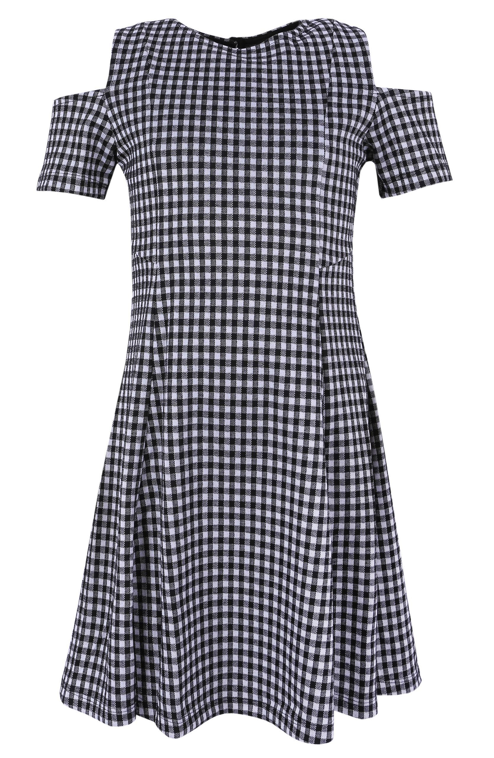 Schwarz-weißes Kleid mit ausgestelltem Schößchen.