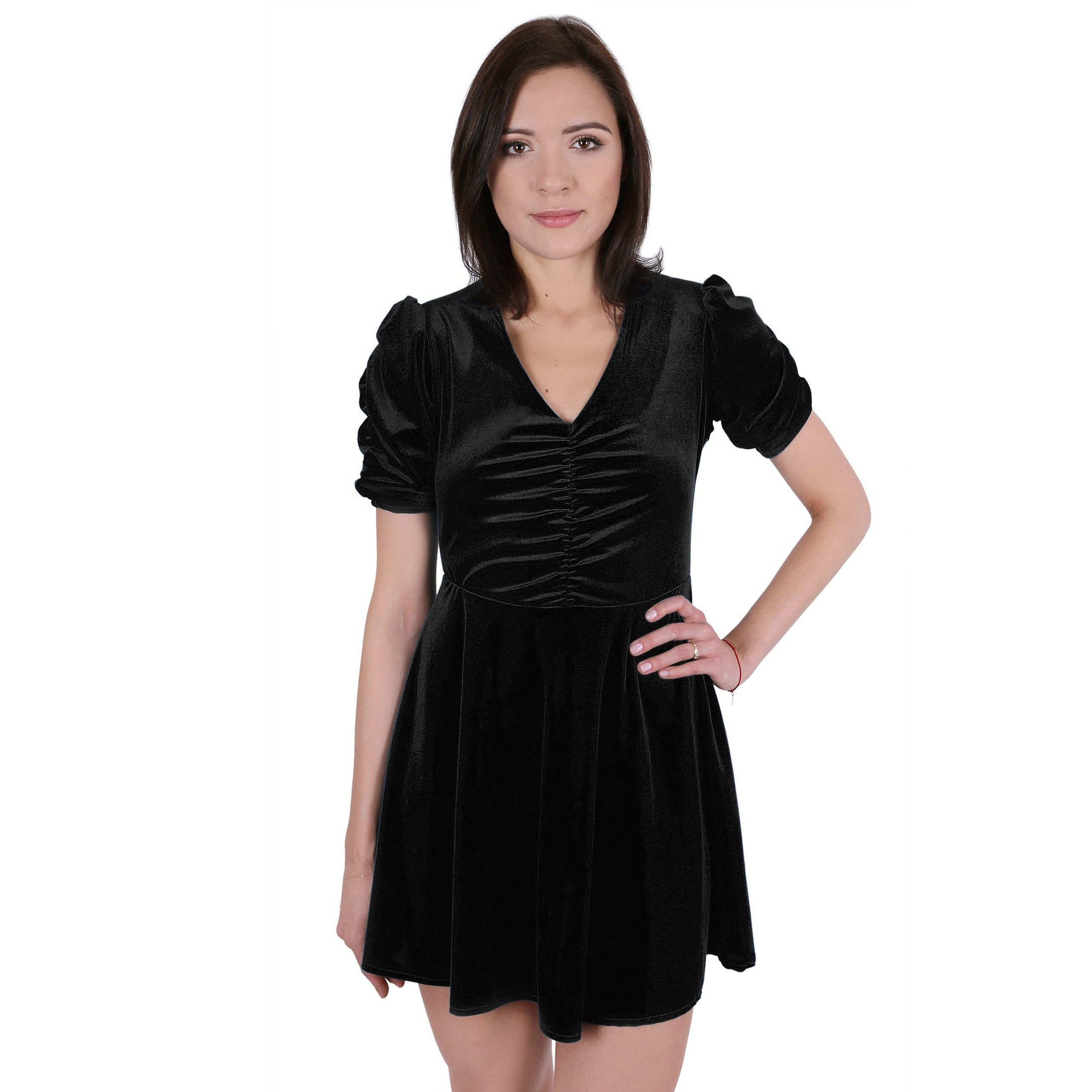Schwarzes Minikleid aus Velours mit gefälteten Ärmeln mit 3/4 Длина und Drapierung am Ausschnitt.