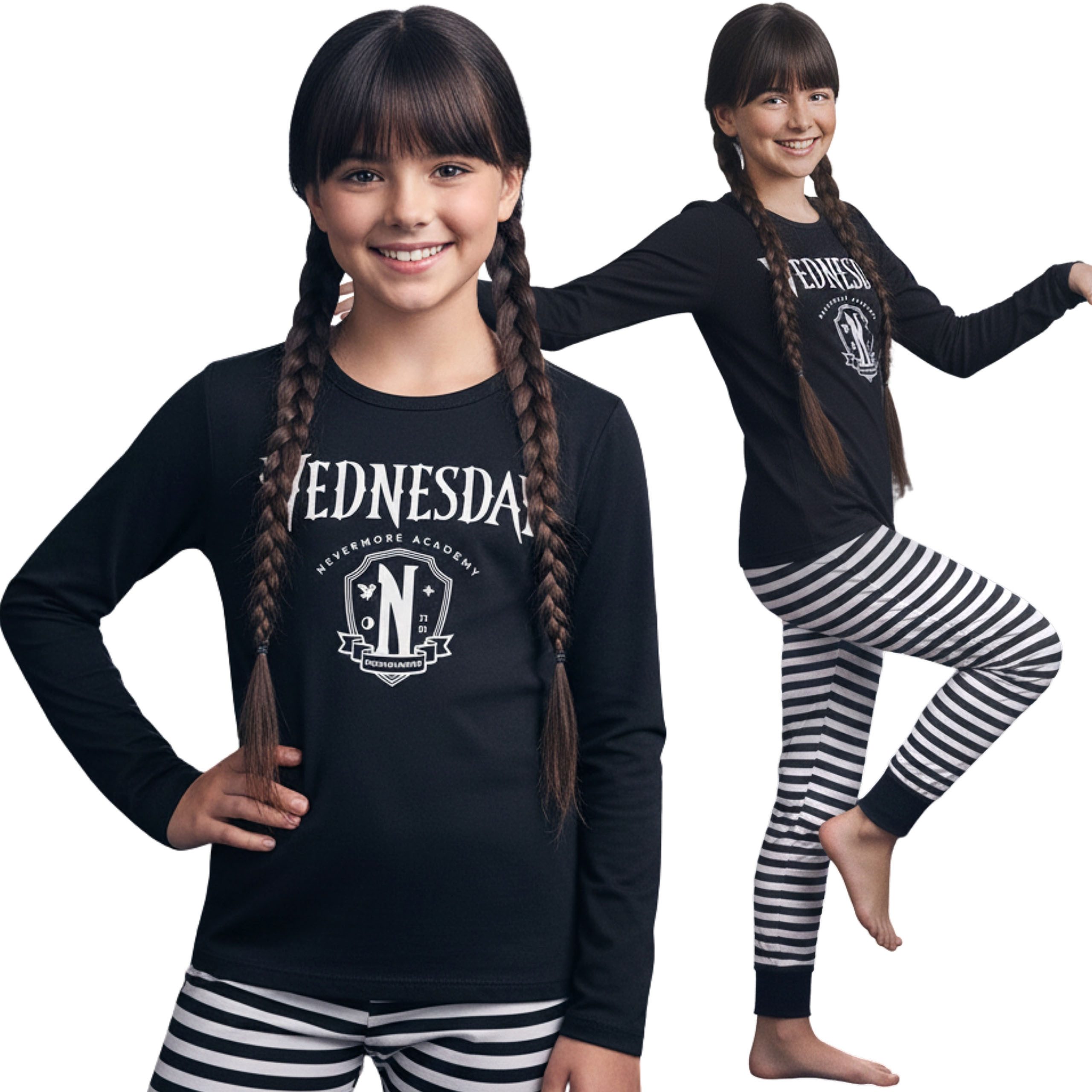 Die Mädchenpyjamas mit Wednesday Addams-Motiv sind ein Angebot für Fans der Kultfigur aus der Serie. Das Set besteht aus einem schwarzen Oberteil mit „Wednesday”-Aufdruck und dem Wappen der Nevermore Academy sowie einer bequemen Hose mit schwarz-weißen Streifen. Das weiche, atmungsaktive Material sorgt für Komfort und Bewegungsfreiheit während der ganzen Nacht. Der elastische Bund und die Bündchen an den Hosenbeinen garantieren eine perfekte Passform. Das stilvolle Design macht es zu einer großartigen Geschenkidee für junge Fans der Serie.