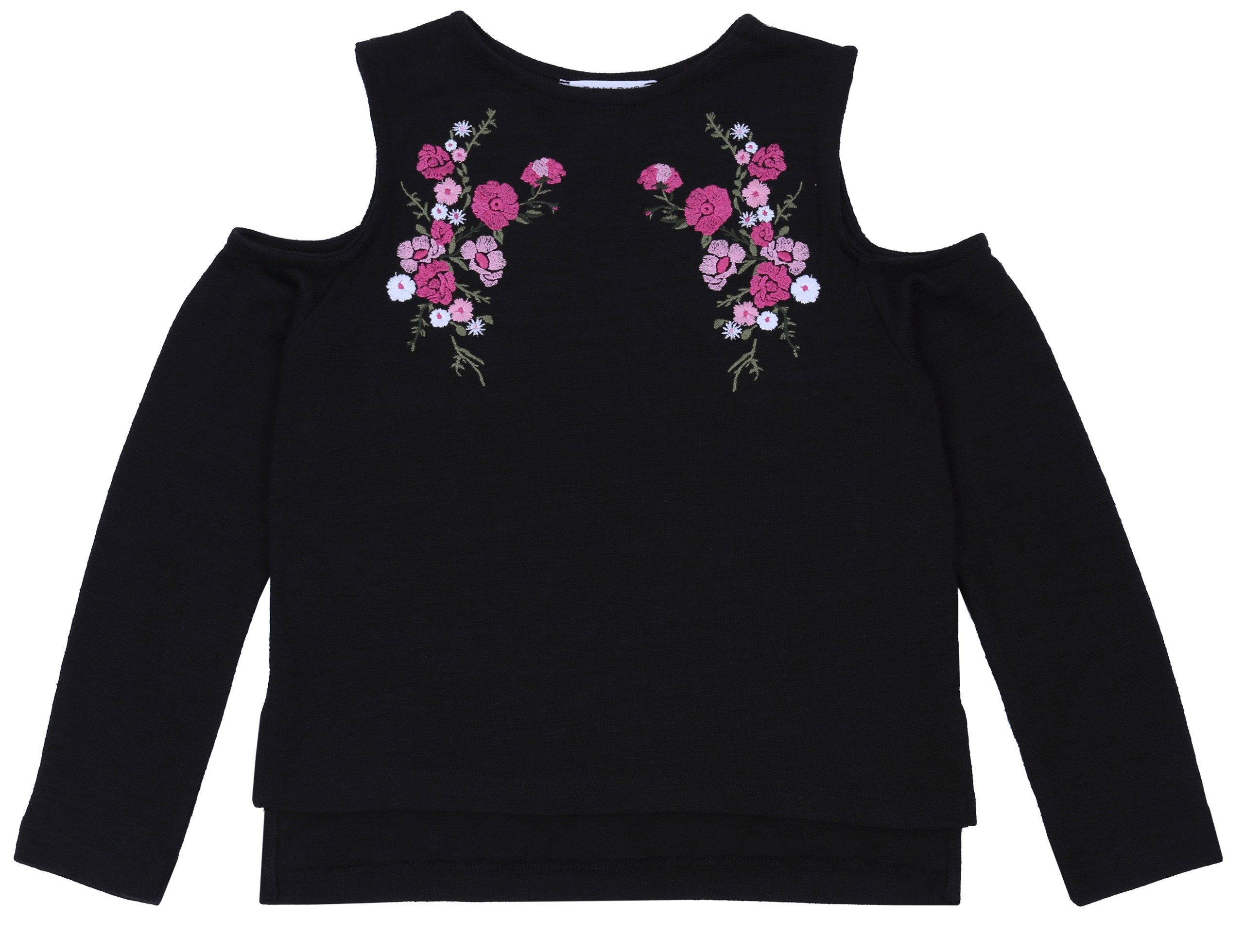 • Schwarzer Blumenpullover, ausgeschnittene Schulternärmel 10-11 Jahre
