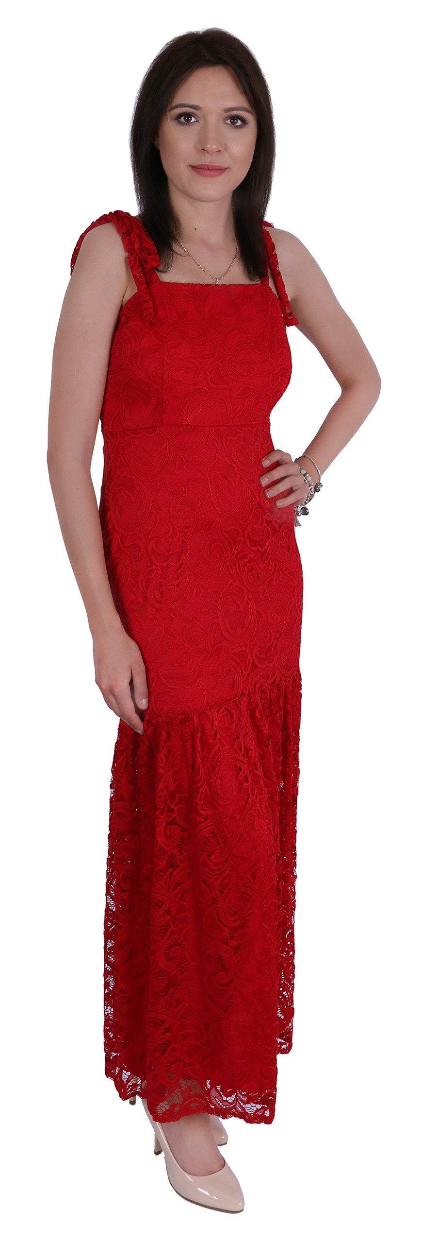 Rotes Spitzenkleid mit gebundenen Trägern.