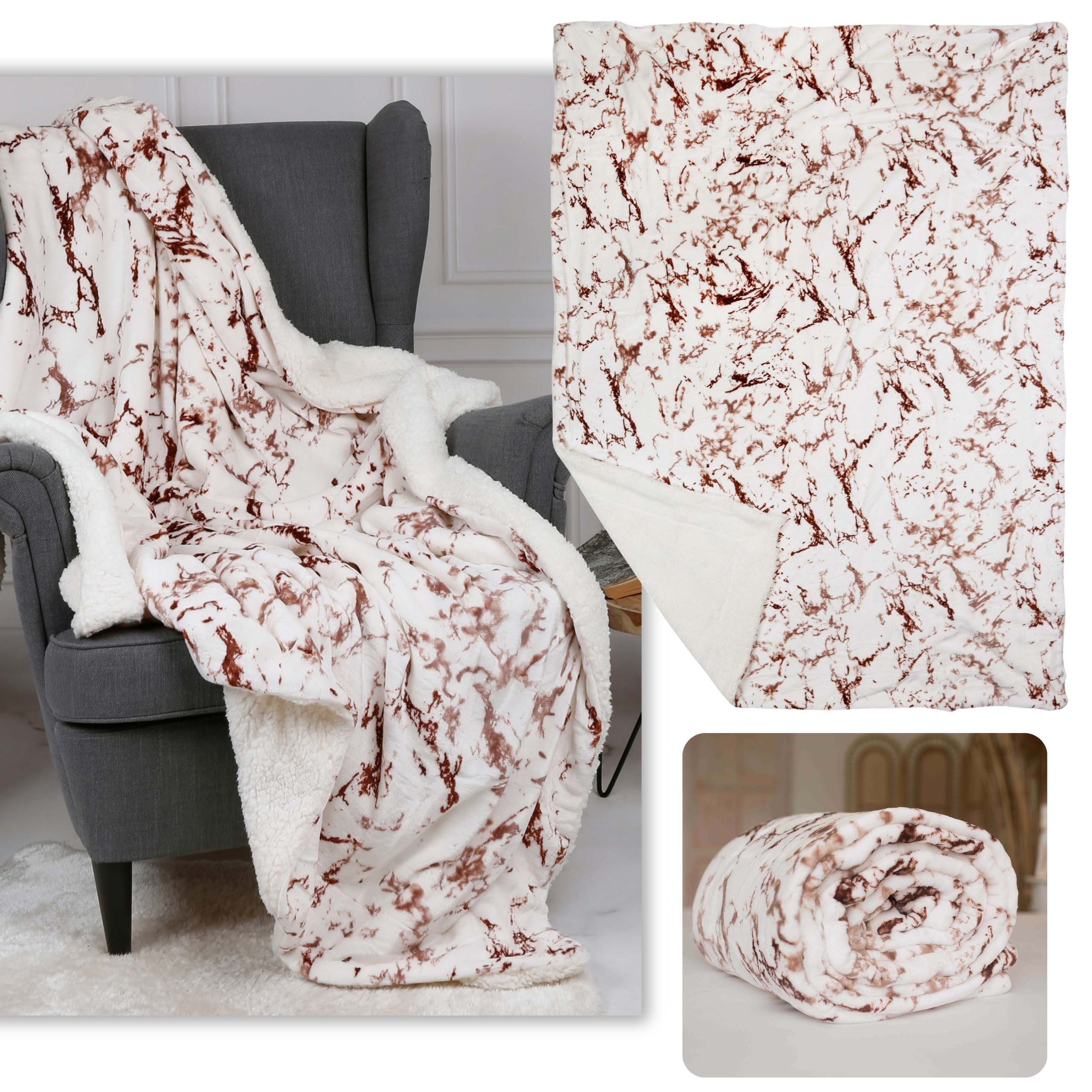 Die Decke ist doppelseitig, wobei eine Seite mit einem eleganten Marmormuster verziert ist und die andere mit weichem Plüschfell besetzt ist, was ihr einen luxuriösen Touch verleiht.