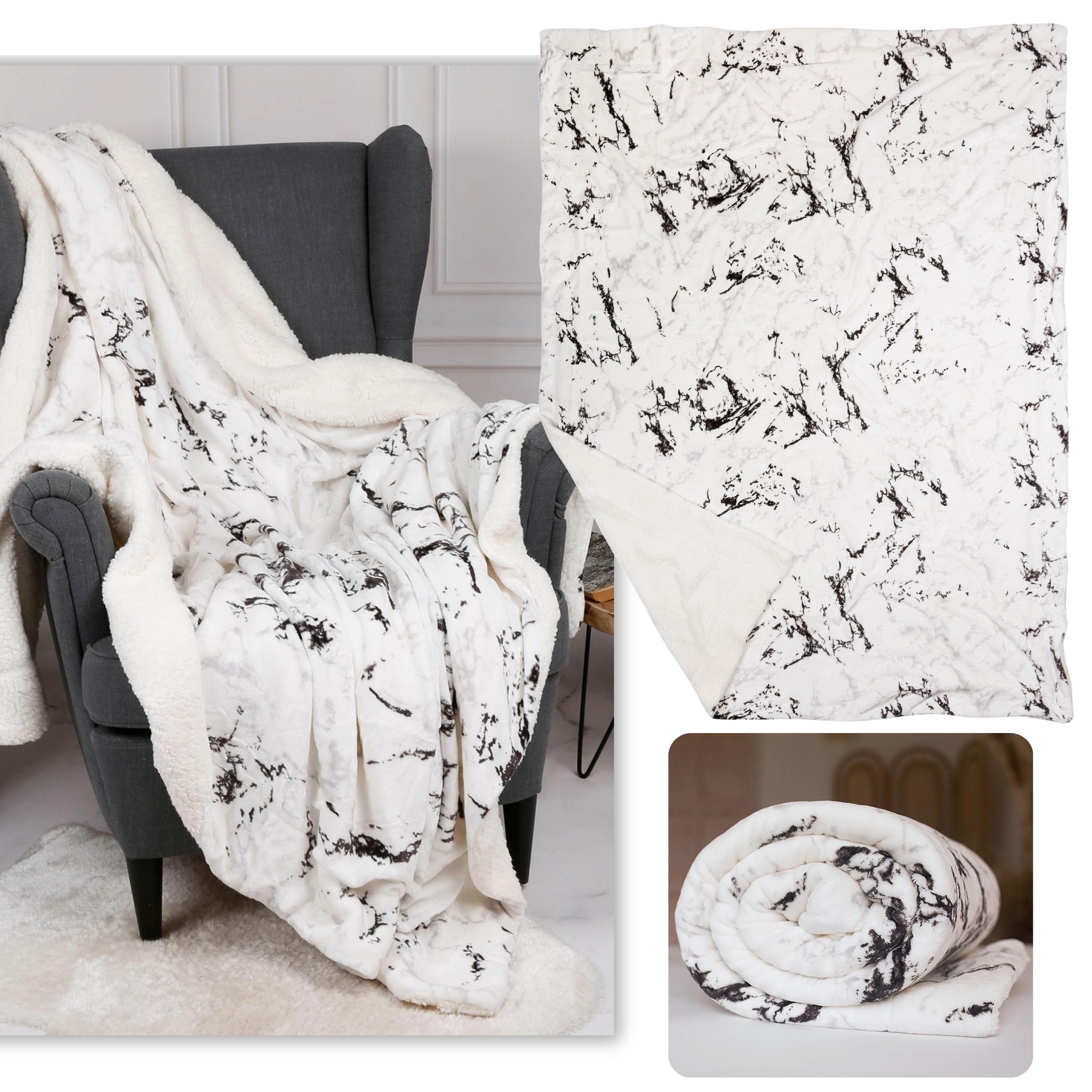 Die Decke ist doppelseitig, wobei eine Seite mit einem eleganten Marmormuster verziert ist und die andere mit weichem Plüschfell besetzt ist, was ihr einen luxuriösen Touch verleiht.