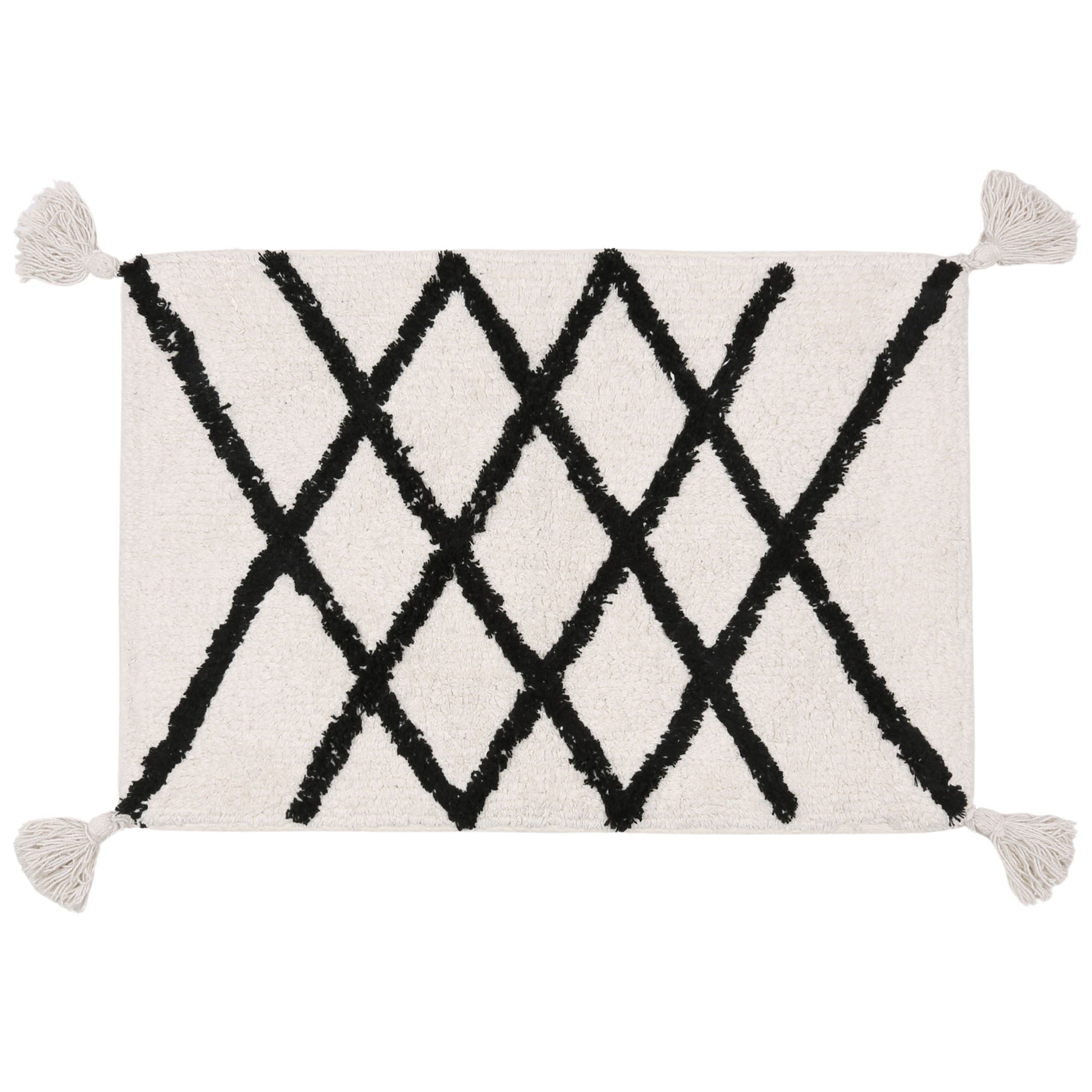 Ein Badezimmerteppich aus Baumwolle mit einem dekorativen schwarzen Aufdruck verleiht Ihrem Badezimmer einen einzigartigen Look.