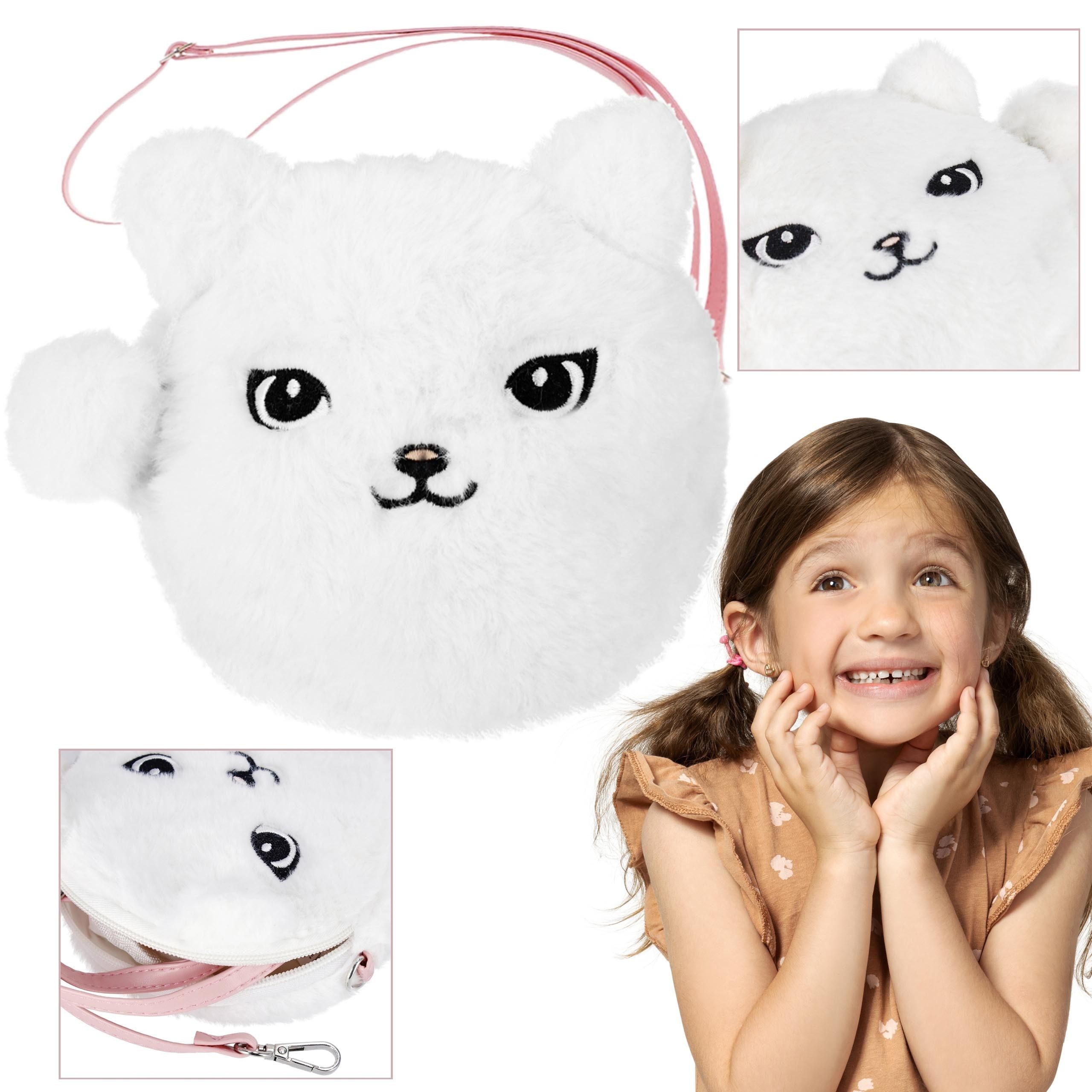 Eine weiße Plüschhandtasche für Mädchen mit dem Bild einer niedlichen Katze.