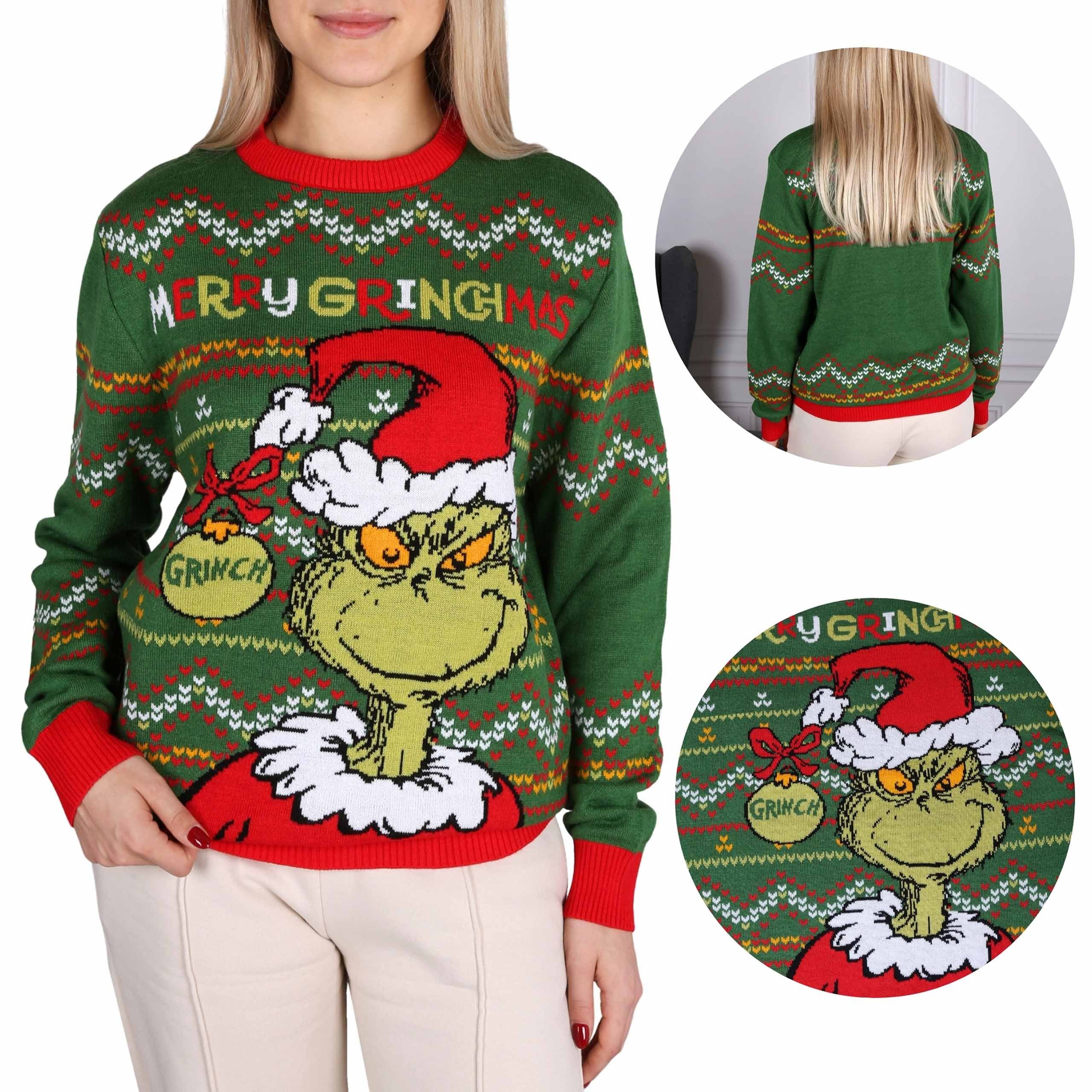 Ein Weihnachtspulli mit einem Grinch-Motiv in einer Weihnachtsmannmütze ist ideal für alle, die einen humorvollen Ansatz für den Weihnachtsstil mögen.