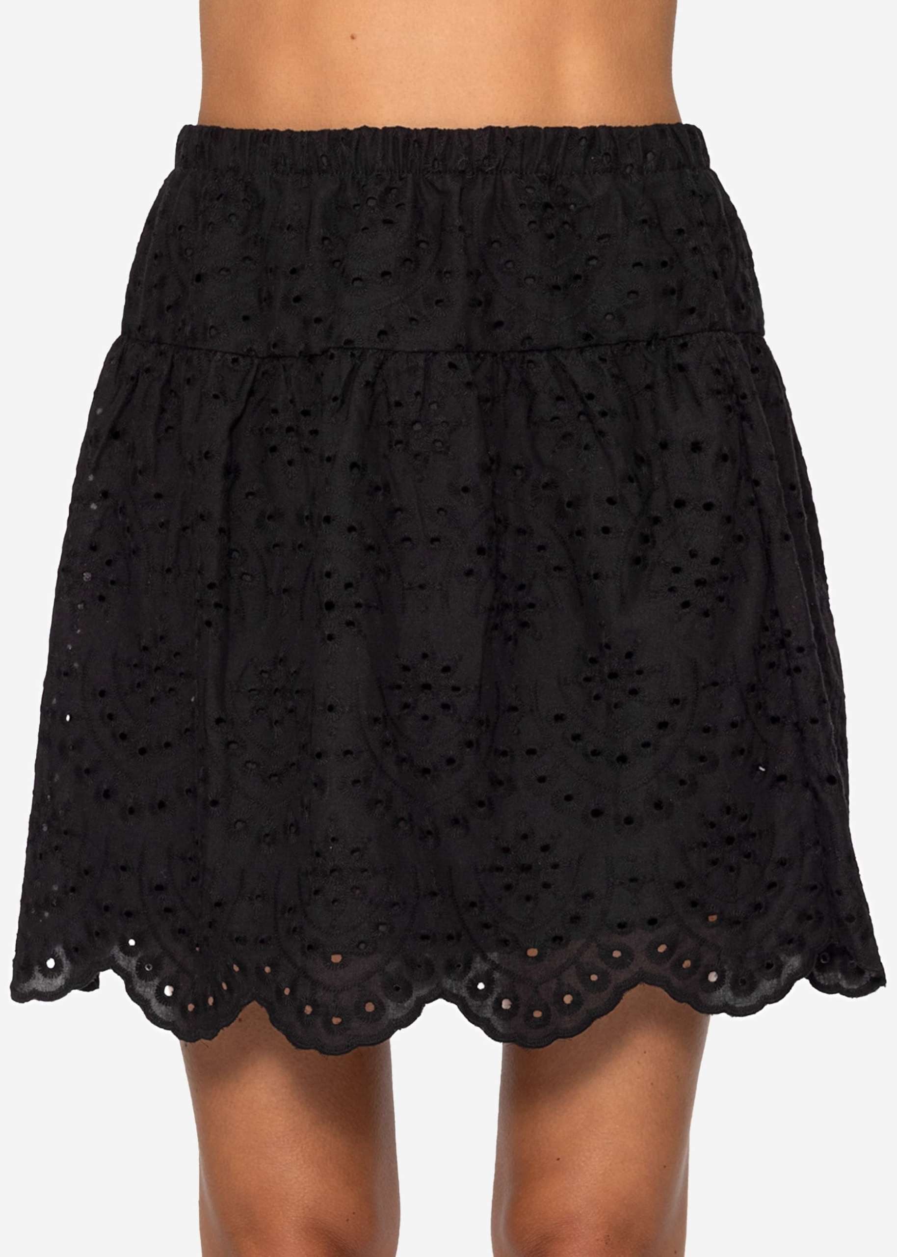 DETAILS: Feine Broderie-Ausschnitte, ein welliger Abschluss und die zart strukturierte Oberfläche machen den Rock zu einem echten Hingucker mit liebevollen Details