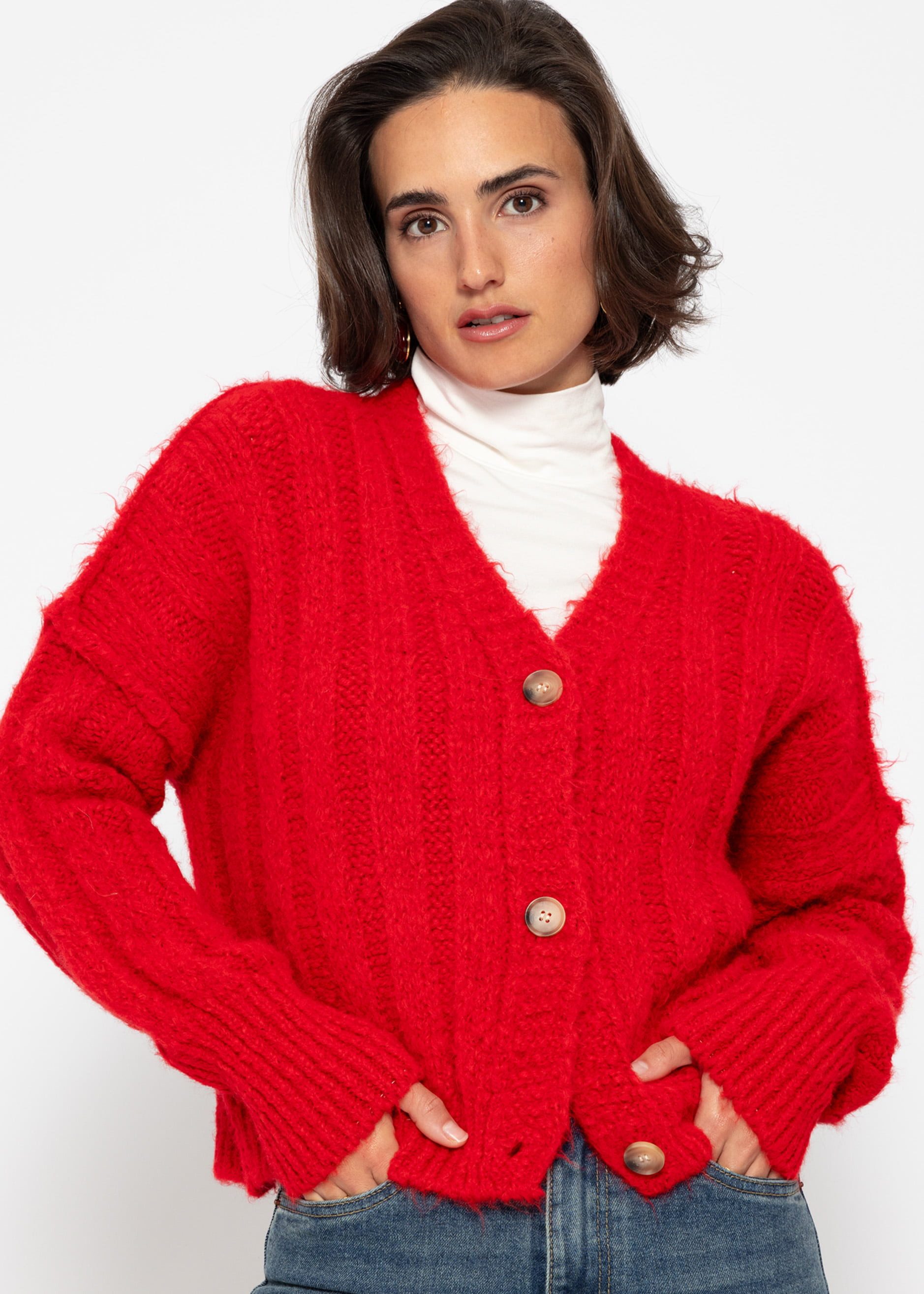 Besondere Merkmale | Femininer Rippstrick-Cardigan mit Knopfleiste Rot Hellgrau |
