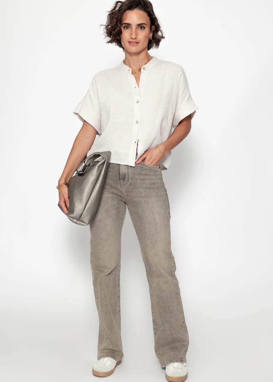 Besondere Merkmale | Musselinbluse im verkürztem Schnitt mit Stehkragen Hellbeige Schwarz |