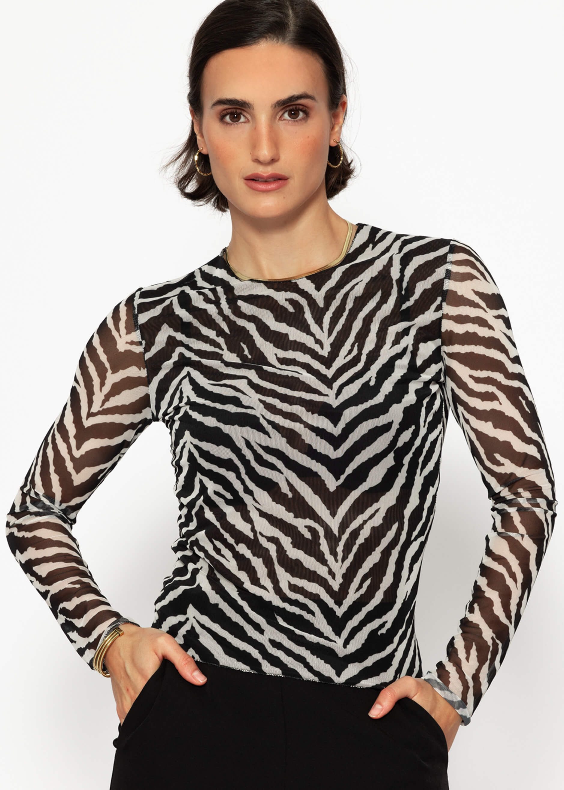 Besondere Merkmale | Figurbetonte Mesh Bluse Damen elegant in Schlangen Zebra Optik Schwarz |