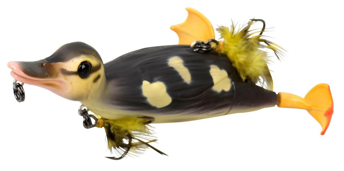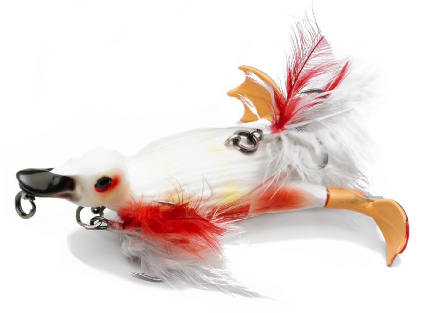 Wird die Schnur an der Brust montiert, läuft der gesamte Köder höher, ähnlich wie ein panisch flüchtendes Entlein. Es kann schnell oder langsam, mit kurzen oder langen Zügen gefischt werden. Dieser Köder imitiert ein Entlein realistisch nach!