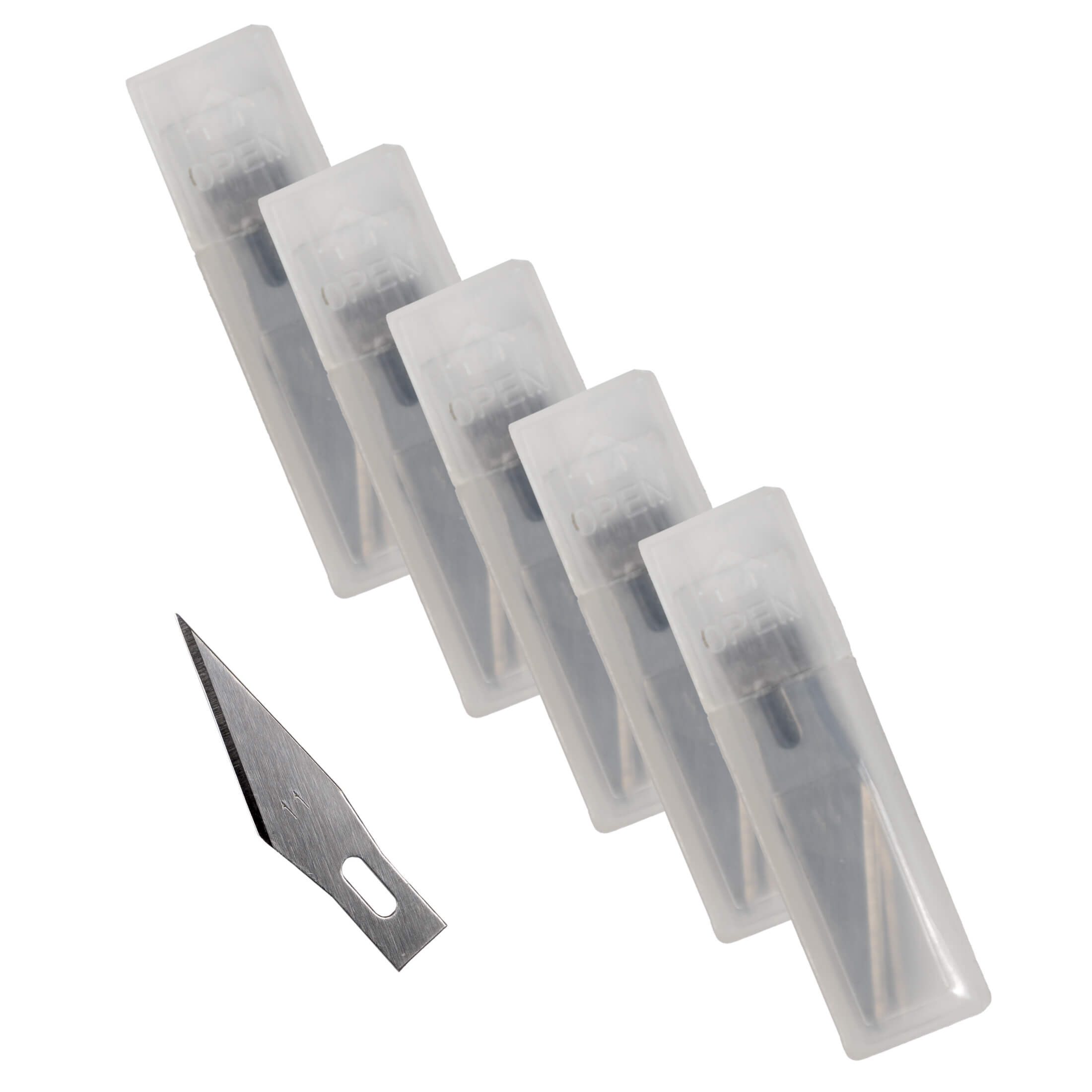 50 Skalpell-Klingen für Bastelmesser und Hobbymesser. Geeignet für alle gängigen Hobbymesser und Skalpelle. Die Ersatzklingen sind zu je 10 Stück im praktischem Köcher verpackt.