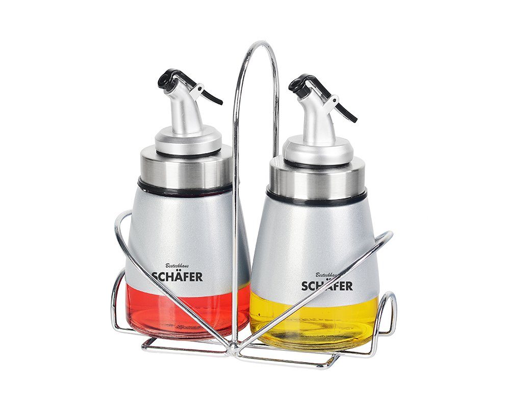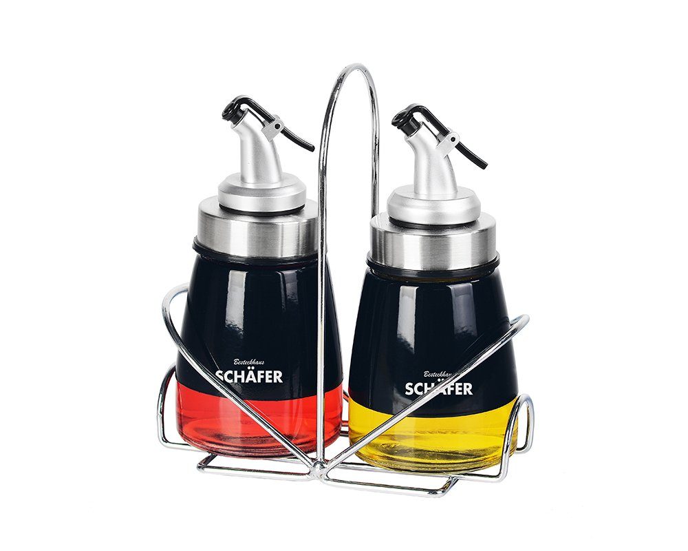 Essig & Öl sind das ideale Duo für die Küche – ob nun in der Gastronomie oder daheim. Die zwei Gefäße finden Platz in einer formschönen Menage, also einem Gestell mit Tragegriff.