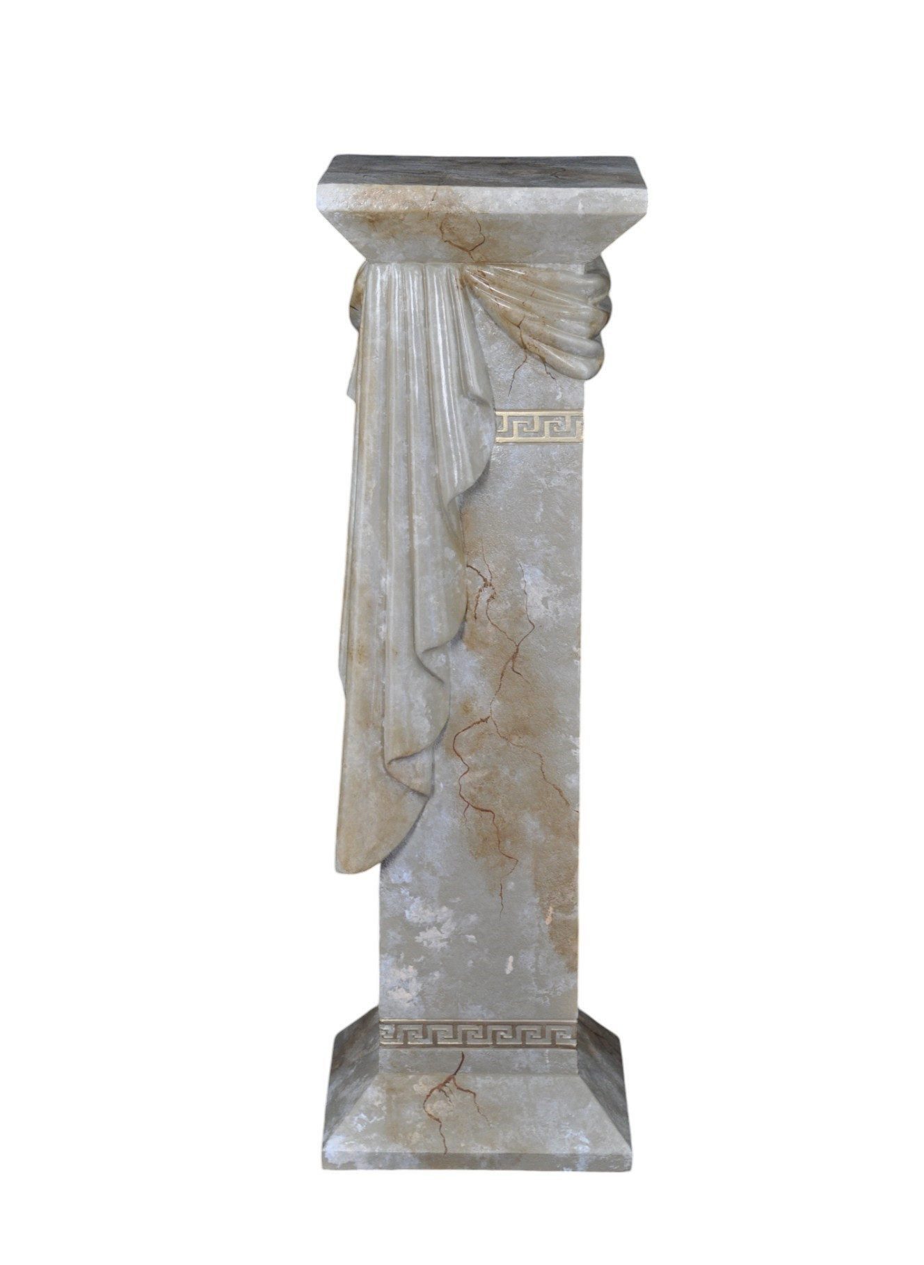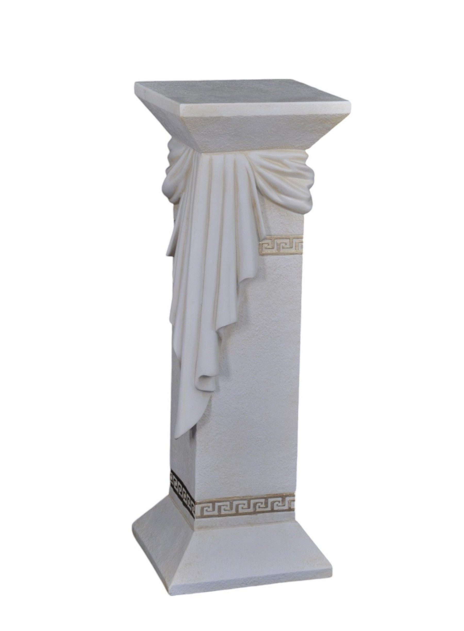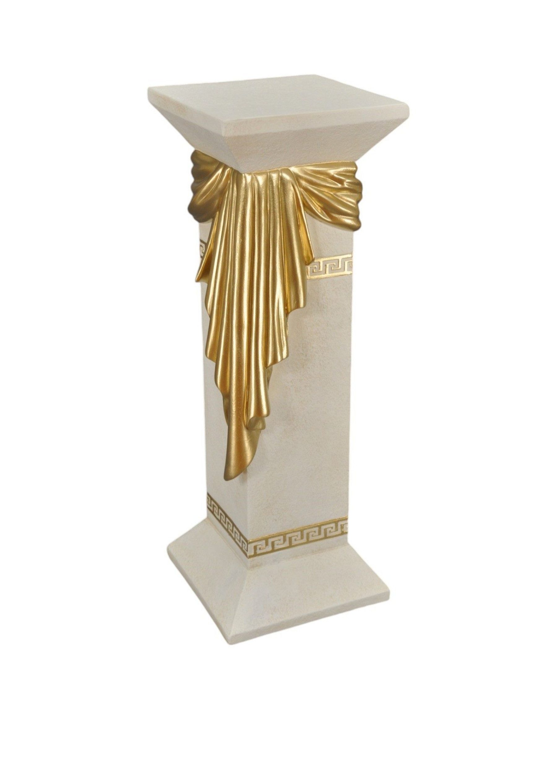 Diese elegante Dekosäule im klassisch griechischen Stil verleiht Ihrem Raum eine majestätische Note. Mit einer beeindruckenden Höhe von 80 cm und einer quadratischen Grundfläche von 30 x 30 cm bietet sie eine perfekte Plattform für Ihre dekorativen Elemente. Die handbemalte Säule in strahlendem Weiß wird durch goldene Akzente veredelt - besonders auffällig ist die kunstvoll drapierte goldene Stoffbahn, die sich elegant um den oberen Teil der Säule schmiegt. Der klassische Mäander-Fries, ein typisches Element griechischer Architektur, ziert den Sockel und den oberen Rand. Diese vielseitige Säule kann sowohl als Beistelltisch als auch als Podest für Vasen, Skulpturen oder andere Dekorationsobjekte verwendet werden. Die Kombination aus zeitloser Form und edlen Details macht dieses Möbelstück zu einem außergewöhnlichen Blickfang in jedem Wohnambiente.