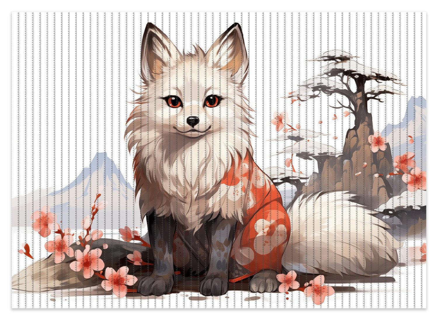Diese malerische Illustration fängt die schlichte Eleganz eines Fuchses ein. Geschmückt mit einem Muster aus traditionellen Ornamenten, blickt er sanft aus dem Bild heraus, seine Augen voller Weisheit. Im Hintergrund zeichnen sich zarte Kirschblütenzweige gegen eine ruhige Berglandschaft ab, was der Szene eine friedliche und poetische Stimmung verleiht.