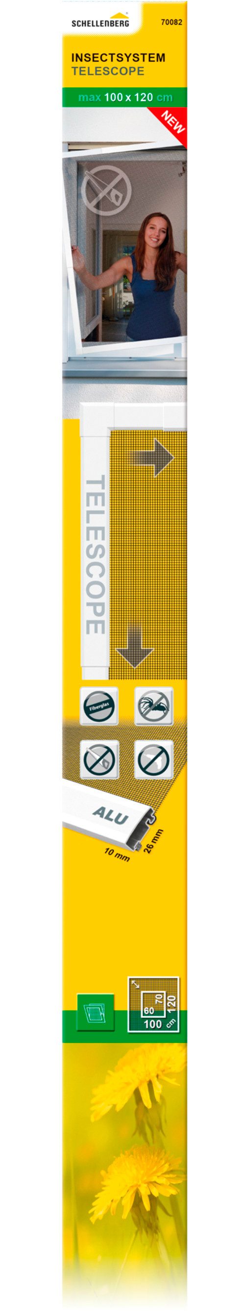 Mit dem Fliegengitterfenster Telescope passen Sie den Insektenschutz individuell an Ihr Fenstermaß an, ganz ohne sägen oder bohren. Das Komplettset besteht aus ausziehbaren Aluminiumrahmenprofilen, Fiberglasgewebe sowie Montagezubehör. Die ausziehbaren Rahmenprofile haben eine hochwertige, matt-sandierte Oberfläche. Einen erweiterten Schutz vor kleineren Kriech- und Krabbeltieren bietet die im Rahmen zusätzlich eingezogene Bürstendichtung. Das Insektenschutzgewebe aus Fiberglas ist reißfest und bietet eine optimale Durchsicht ins Freie. Die minimalen Maße des Fliegengitterfensters mit dem Maß 100 x 120 cm, betragen 60 x 70 cm. Bei dem Fliegengitter mit dem Maß 140 x 150 cm, beträgt das minimale Maß 80 x 85 cm. Der Insektenschutz wird nach dem Zusammenbau in den Fensterrahmen eingehängt und kann jederzeit wieder entfernt werden. Für den Einbau hinter einen Rollladen ist die Einbautiefe von 14, oder 16 mm zu beachten.