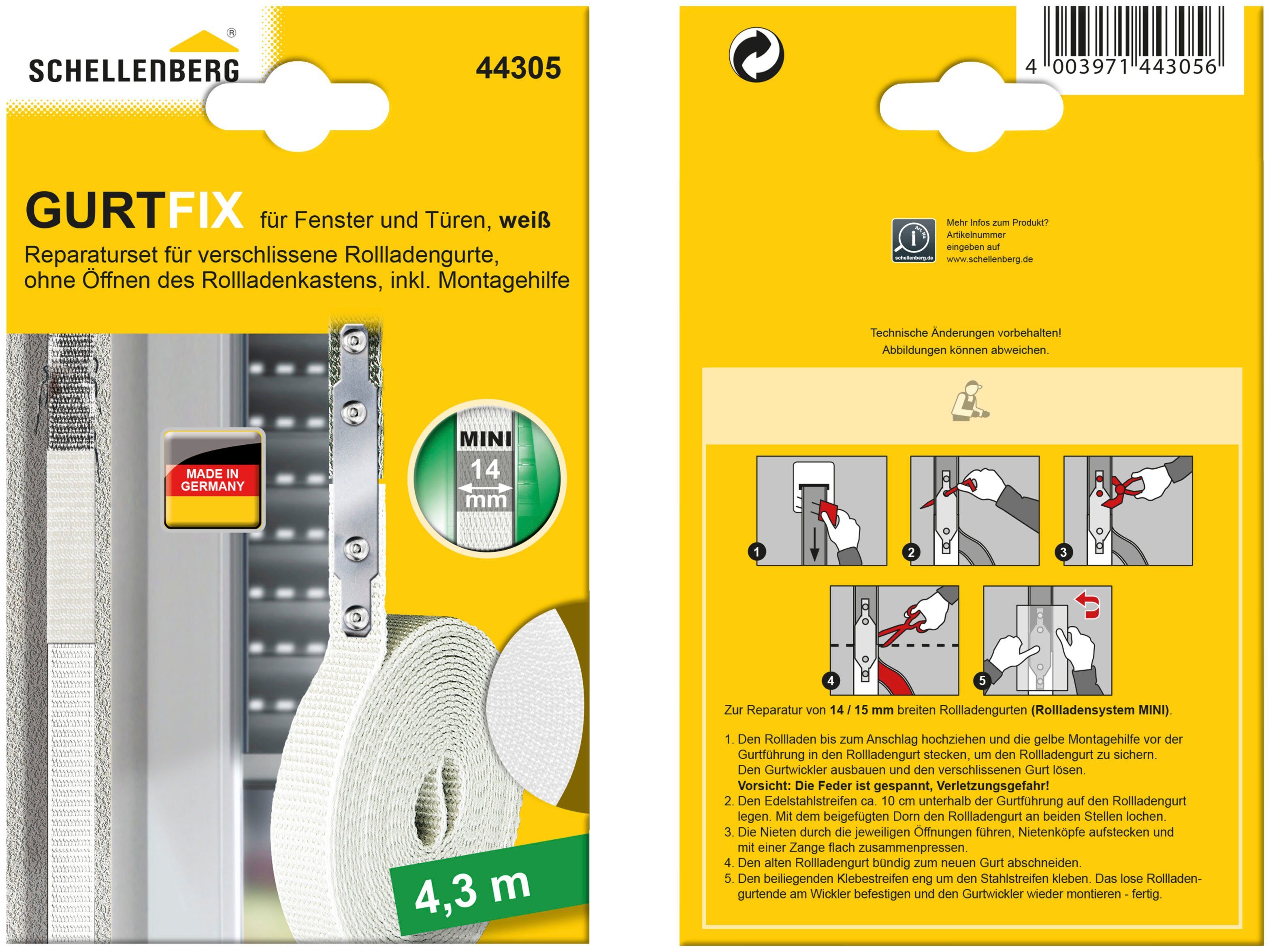 Mit dem Gurtfix Reparaturset können Sie mit wenig Zeitaufwand einen alten oder verschlissenen Rollladengurt reparieren und austauschen, ohne den Rollladenkasten öffnen zu müssen. Dieses Gurtfix Reparaturset ist für das Rollladensystem Mini ausgelegt und beinhaltet einen strapazierfähigen Rollladengurt mit 14 mm Breite und 4,3 m Длина. Das Reparaturset besteht aus einem Gurtband, farblich abgepasstem Klebestreifen sowie einem Fixier-Set aus Edelstahl und einer praktischen Montagehilfe. Bei der Montage wird der neue Rollladengurt etwa 10 cm unterhalb der Gurtführung fest mit dem alten Gurtband verbunden. Anschließend wird der verschlissene Rollladengurt bündig abgetrennt und die Reparaturstelle mit dem farblich abgestimmten Klebestreifen verdeckt.