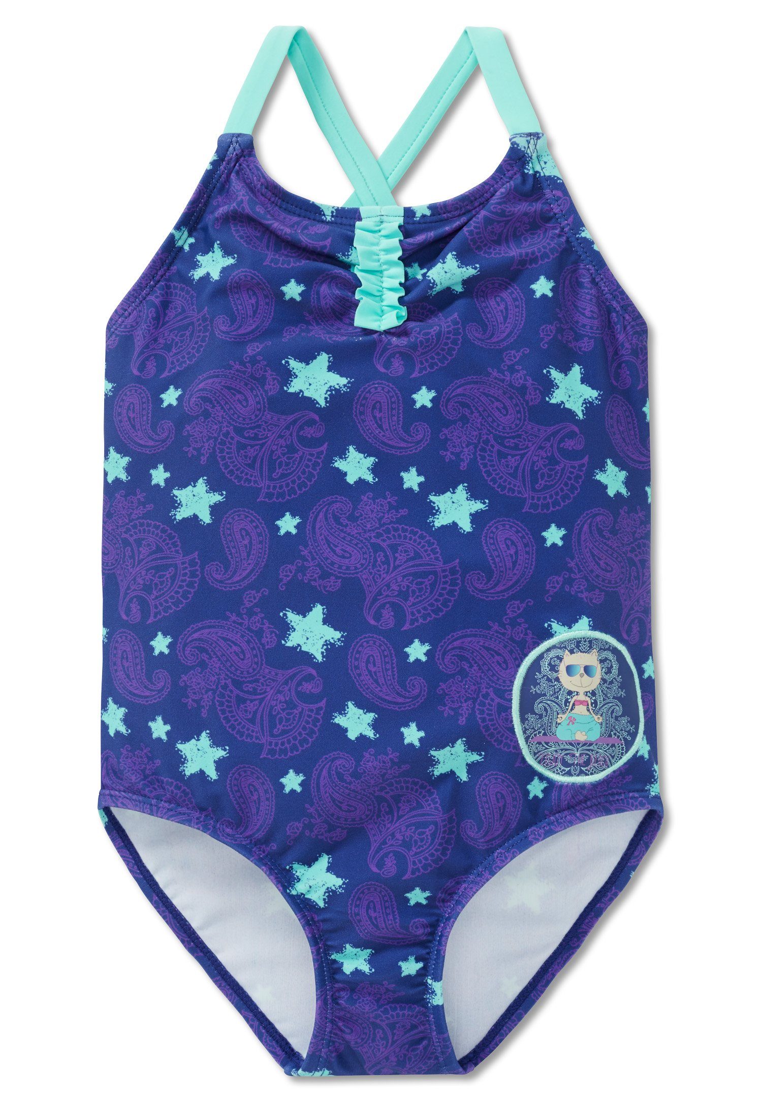Mit lila-farbenem Paisley-Muster und mint-farbenen Sternen, Rüschen im Brustbereich und Träger in Mint, Applikation mit Yoga-Kätzchen Zoe an der Hüfte, Vorderteil komplett mit weichem, hautfreundlichem Mesh unterlegt, ausgestattet mit Lichtschutzfaktor 40+, aus besonders formbeständiger, pflegeleichter Wirkware.