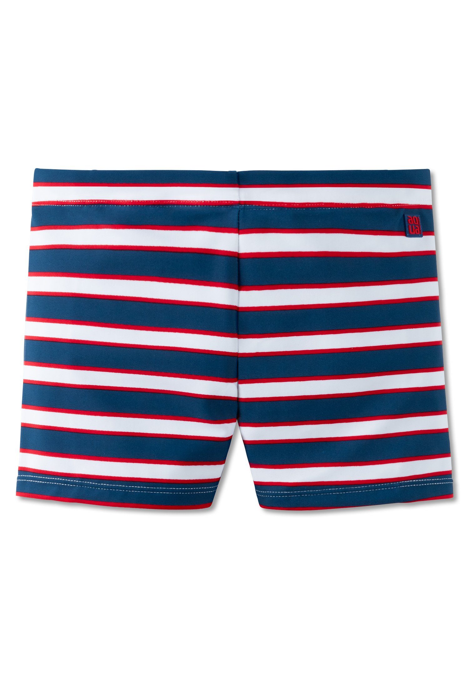 Im sommerlichen Streifen-Look werden diese Jungen-Badeshorts zum richtig tollen Blickfang! Kräftiges Rot, strahlendes Weiß und trendiges Indigo-Blau wechseln sich hier harmonisch ab und werden von der roten Bindekordel am Bund perfekt ergänzt. Im pflegeleichten, weichen Material und mit dem hautfreundlichen Mesh-Einsatz im vorderen Bereich versprechen die Bade-Retroshorts jede Menge Bequemlichkeit. Ein absolutes Lieblingsstück zum Schwimmen.
