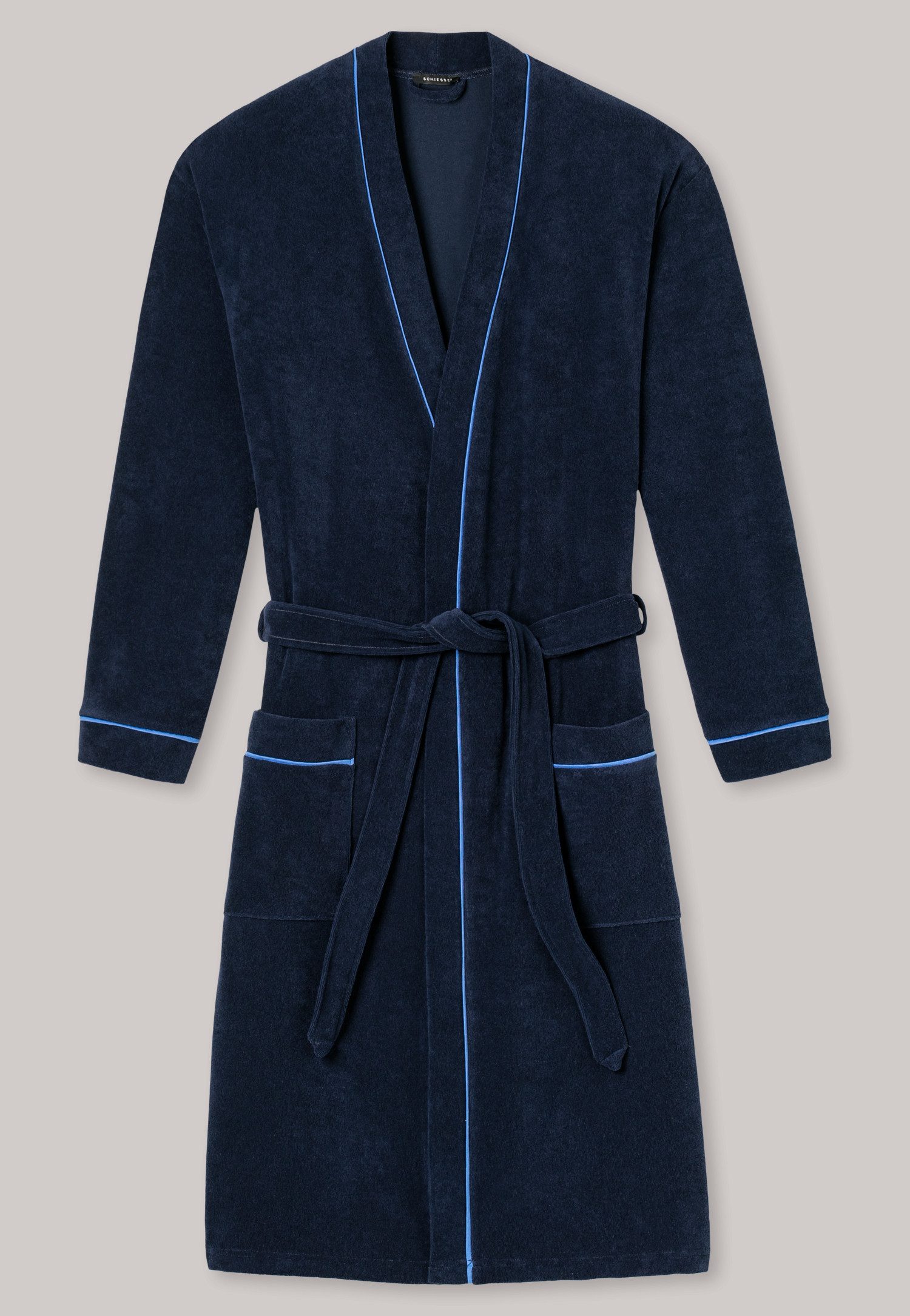 Stilvoll und besonders komfortabel überzeugt dieser navy-blaue Bademantel anspruchsvolle Herren. Hellblaue Paspeln schenken dem Mantel einen eleganten Akzent, der mit den beiden aufgesetzten Taschen sowie einem legeren Bindegürtel harmonisch abgerundet wird. In leichtem, hochwertigem Frottee passt er bequem in jede Reisetasche und ist somit sowohl unterwegs als auch nach dem heimischen Wohlfühlbad der perfekte Begleiter! navy-blauer Herren-Bademantel aus der SCHIESSER-Serie Original Classics mit kontrastfarbenen Paspeln am Leistenabschluss, an den Taschen sowie an den Ärmelabschlüssen zwei aufgesetzte Taschen im vorderen Bereich Bindegürtel praktischer Aufhänger im inneren Nackenbereich in angenehm weicher, leichter Frottee-Qualität