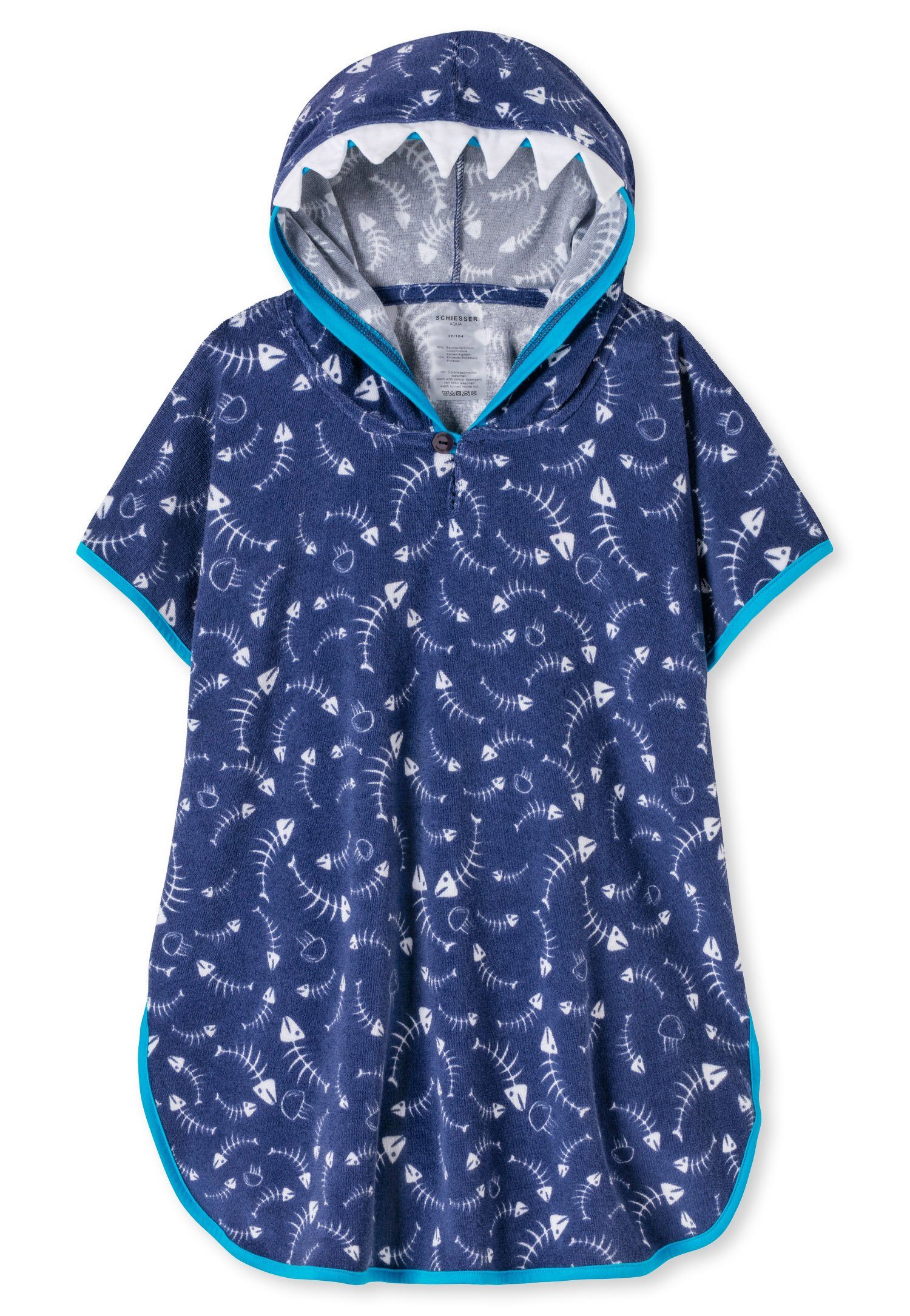 Admiral-blauer Bade-Poncho für Jungen aus der SCHIESSER-Badekollektion Aqua "Shark Fever", auffallende Hai-Kapuze mit 3D-Zähnen, weißes Allovermuster aus Fischgräten und Quallen, Saum-Einfass in Türkis, qualitativ hochwertige, seitliche Druckknöpfe und ein zusätzlicher Knopf im Halsbereich, ausgestattet mit Lichtschutzfaktor 40+, in angenehm weicher Leichtfrottee-Qualität.
