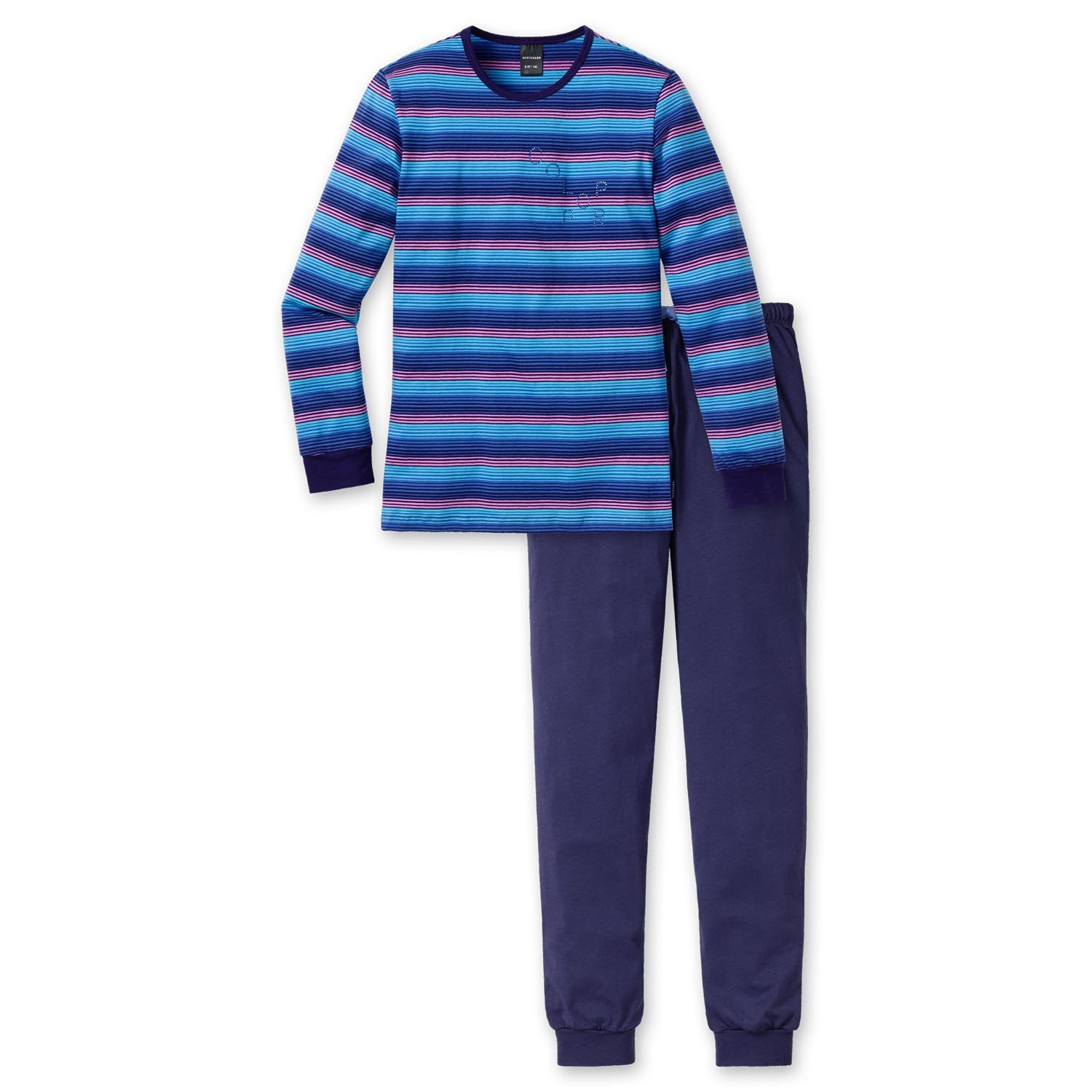 Ein Pyjama bestehend aus einem Mädchen Schlafshirt und einer langen Schlafanzughose mit zauberhaftem Muster. Feine Ringel,dunkelblauer Einfass und der Motivdruck "Color Pop" mit funkelnden, blauen Strasssteinen macht aus dem Oberteil einen coolen Eyecatcher, der perfekt zu der dunkelblauen Hose mit Bindeband und Beinbündchen passt.