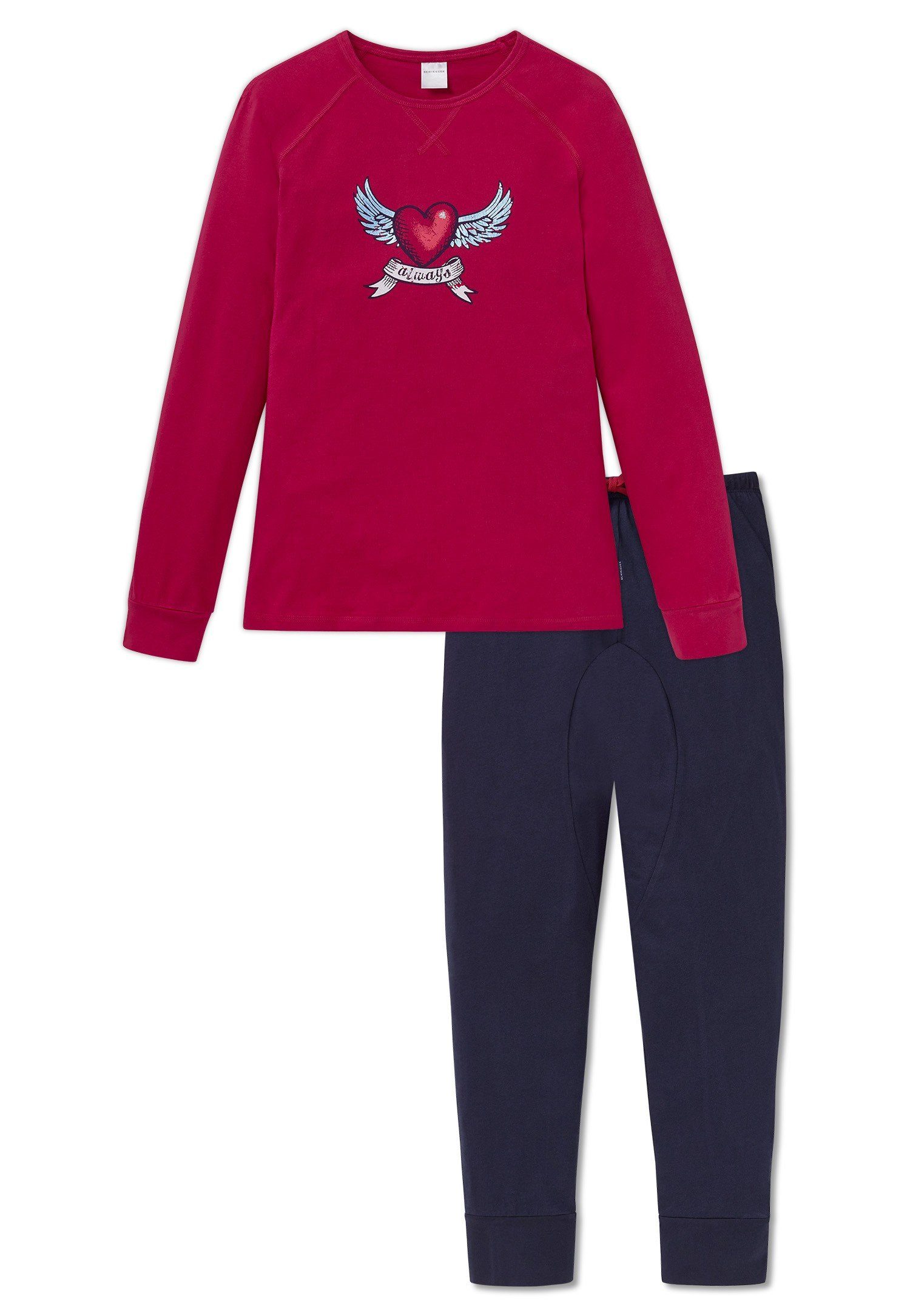 Dieser lange Mädchenschlafanzug sieht nicht nur klasse aus, sondern ist in 100% feiner Baumwolle und mit den Bündchenabschlüssen zudem herrlich bequem! Ein beflügeltes, glitzerndes Herz-Tattoo auf der Brust und die lässige Raglan-Schnittform machen das dunkelrote Oberteil zum echten Hingucker, der perfekt durch die dunkelblaue, tiefer geschnittene Jogg-Pants mit dunkelrotem Bindeband passt. Ein superbequemer Lieblings-Schlafanzug in bester SCHIESSER-Qualität. Mit bequemen Bündchen an den Arm- und Beinabschlüssen, dunkelrotes Oberteil in lässiger Raglan-Schnittform mit Ziernaht unterhalb des Rundhals-Ausschnittes, cooles Tattoo-Motiv auf der Brust: Herz mit glitzernden Flügeln und Schriftzug "always", dunkelblaue, tiefer geschnittene Joggpants mit dunkelrotem Bindeband am Bund, in bequemer, weicher Single-Jersey-Qualität.