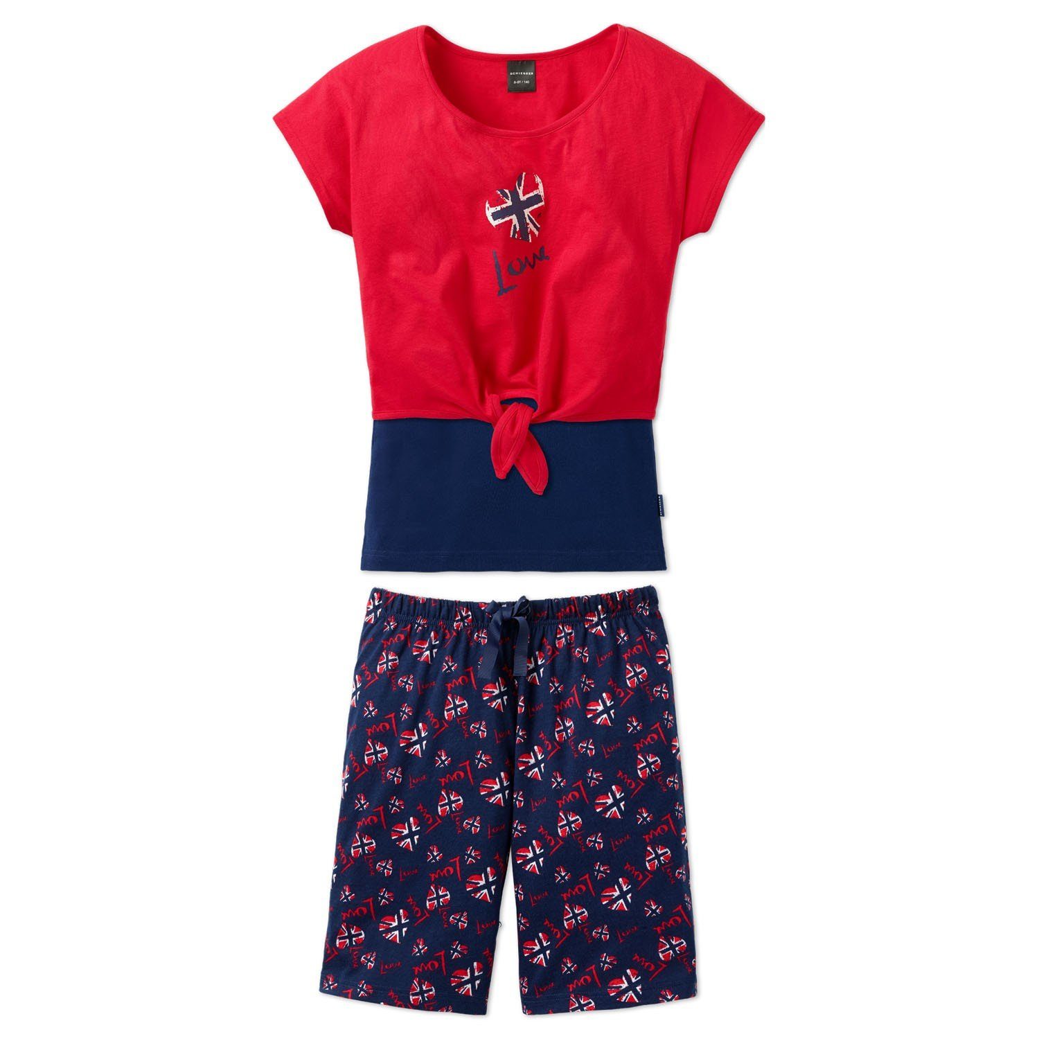 Ein Pyjama bestehend aus einem Mädchen Schlafshirt und einer Schlafanzughose in 100% herrlich softer, warmer Baumwolle. Ein kurzes, rotes T-Shirt zum Knoten mit britischem Herzchen und Schriftzug Love kann lässig über dem dunkelblauen Top getragen werden oder macht nach Lust und Laune auch solo eine tolle Figur. Mit den dunkelblauen Shorts im trendigen Union-Jack-Alloverprint kann der Schlafanzug auf ganzer Linie überzeugen.
